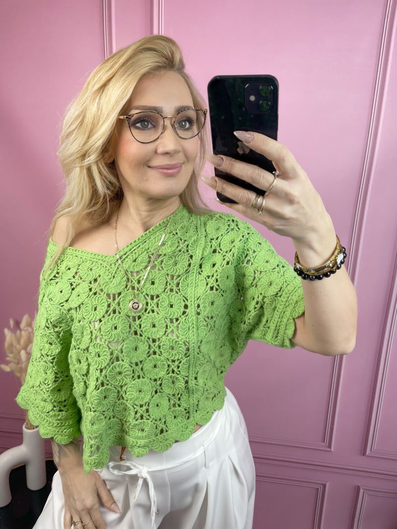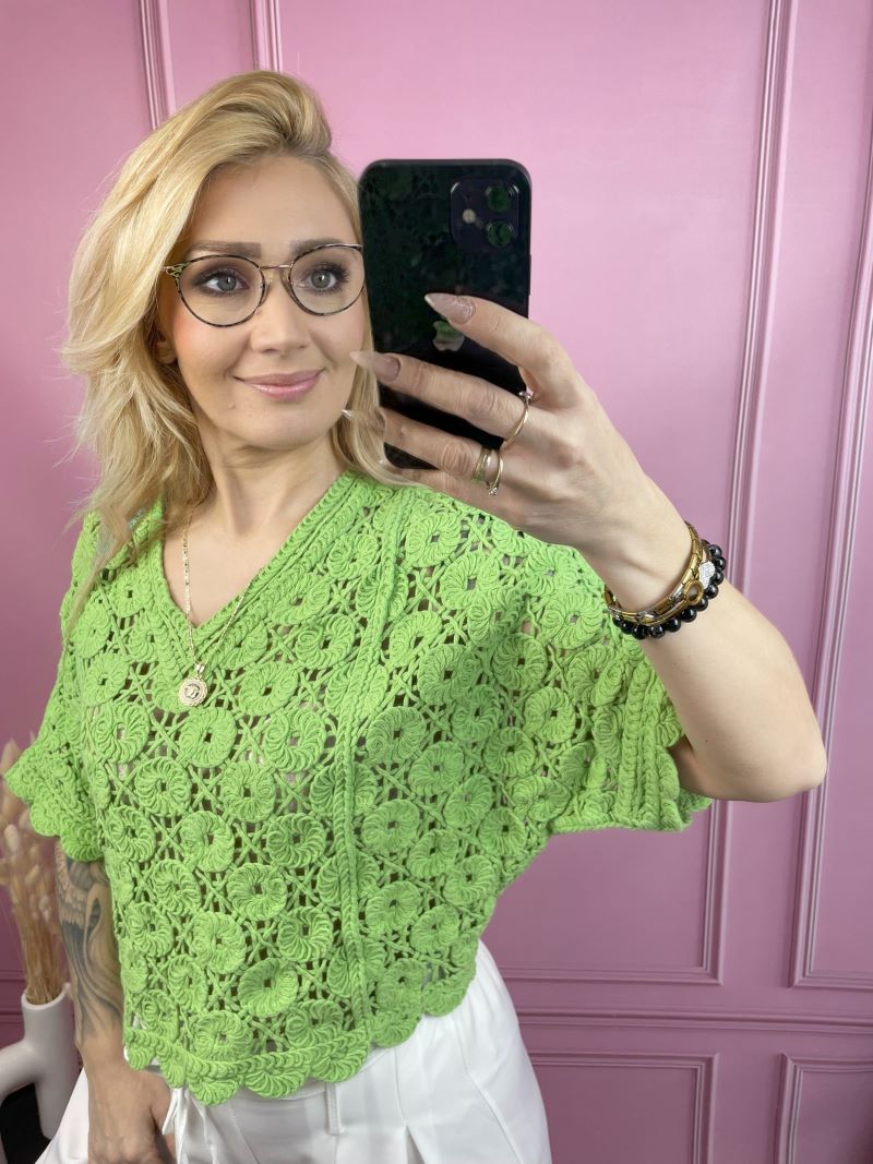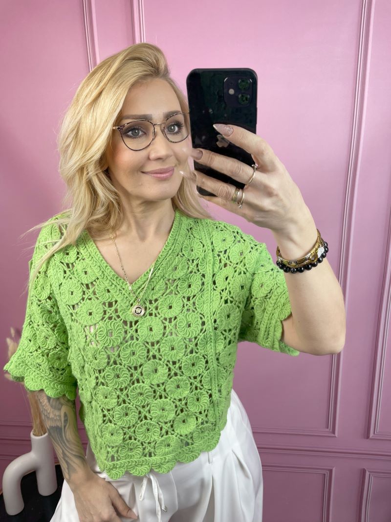 Bluzka Ażurowa z Dekoltem V – Groszkowa Zieleń