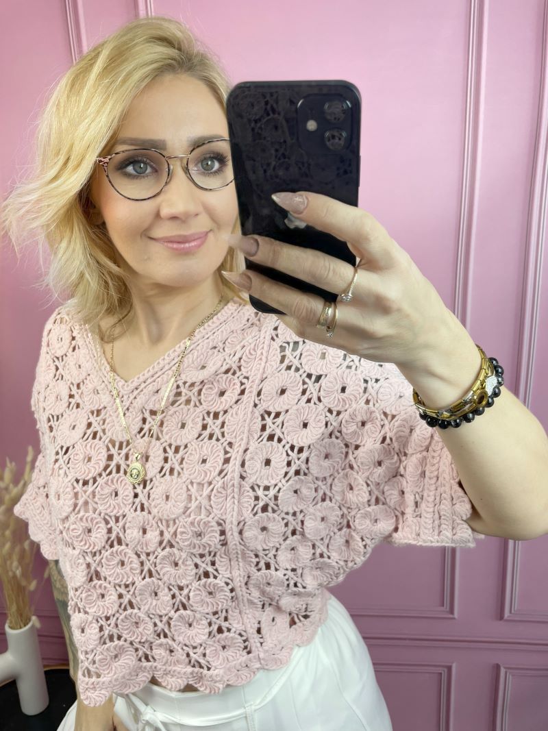 Bluzka Ażurowa z Dekoltem V – Pudrowy Róż
