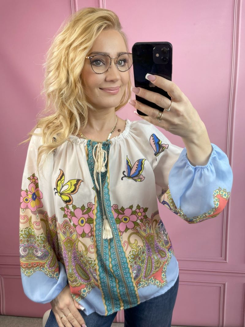 Przepiękny, kolorowy wzór inspirowany stylem indiańskim przyciąga spojrzenia i dodaje charakteru każdej stylizacji, a szerokie, balonowe rękawy nadają całości modowego wyrazu i lekkości.To bluzka, która daje Ci wolność stylu i podkreśla Twoją kobiecość w najpiękniejszy sposób.
