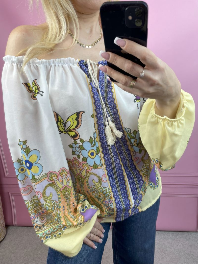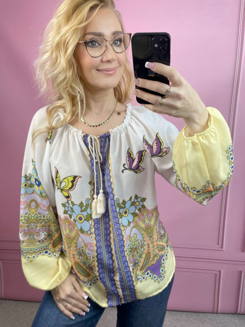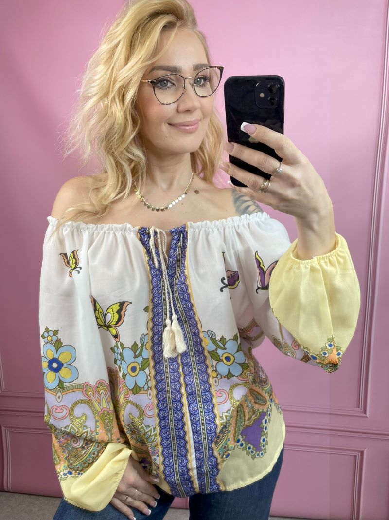 Bluzka Hiszpanka ze Wzorem Indyjskim – Pastelowy Żółty