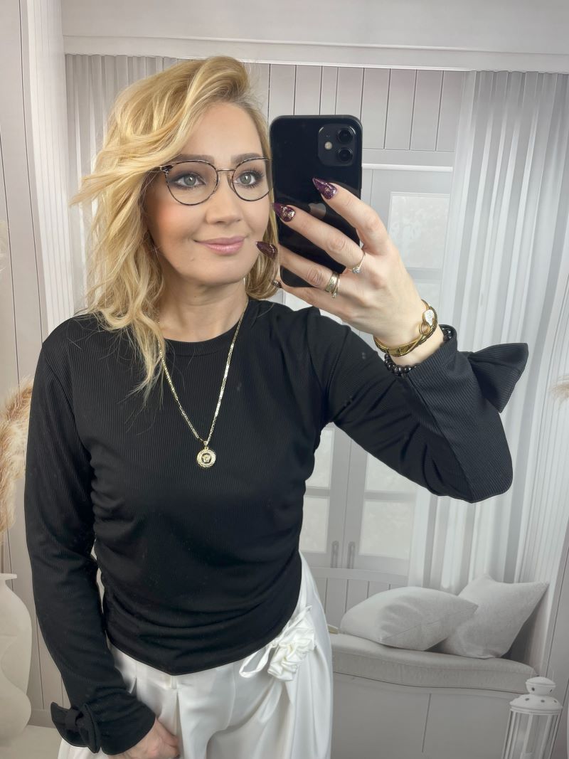 Bluzka Prążkowana z Kokardą Na Mankiecie – Czarna