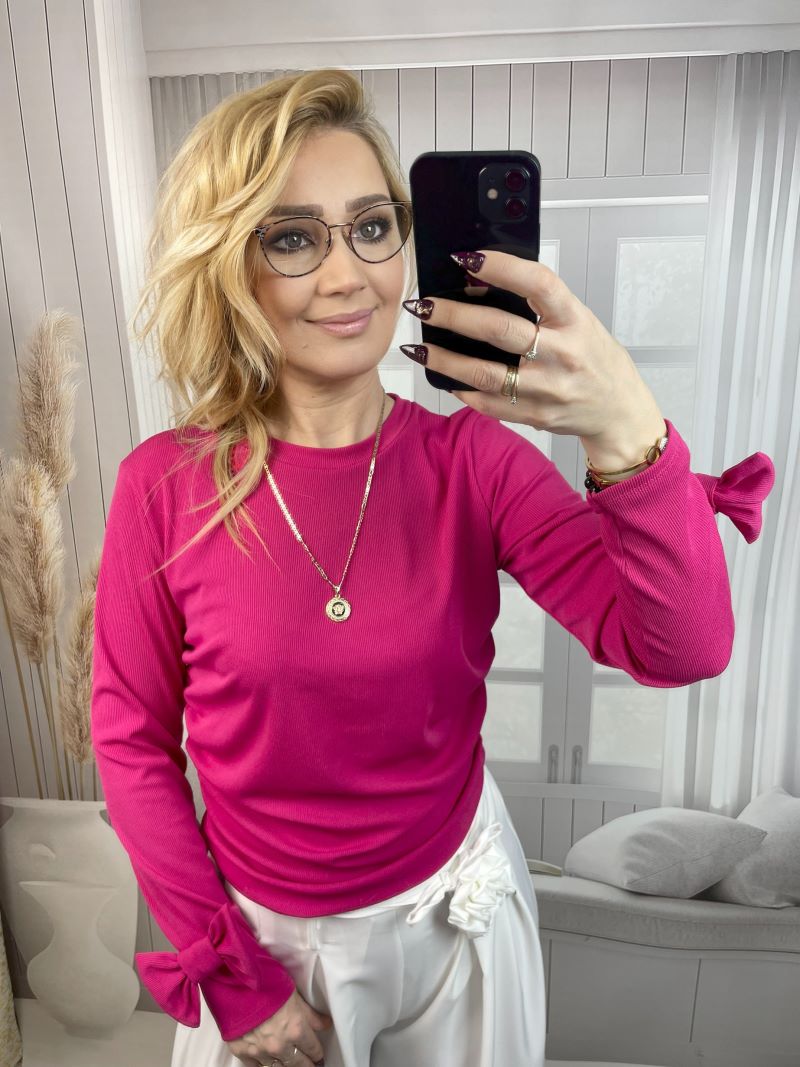 Bluzka Prążkowana z Kokardą Na Mankiecie – Fuksja