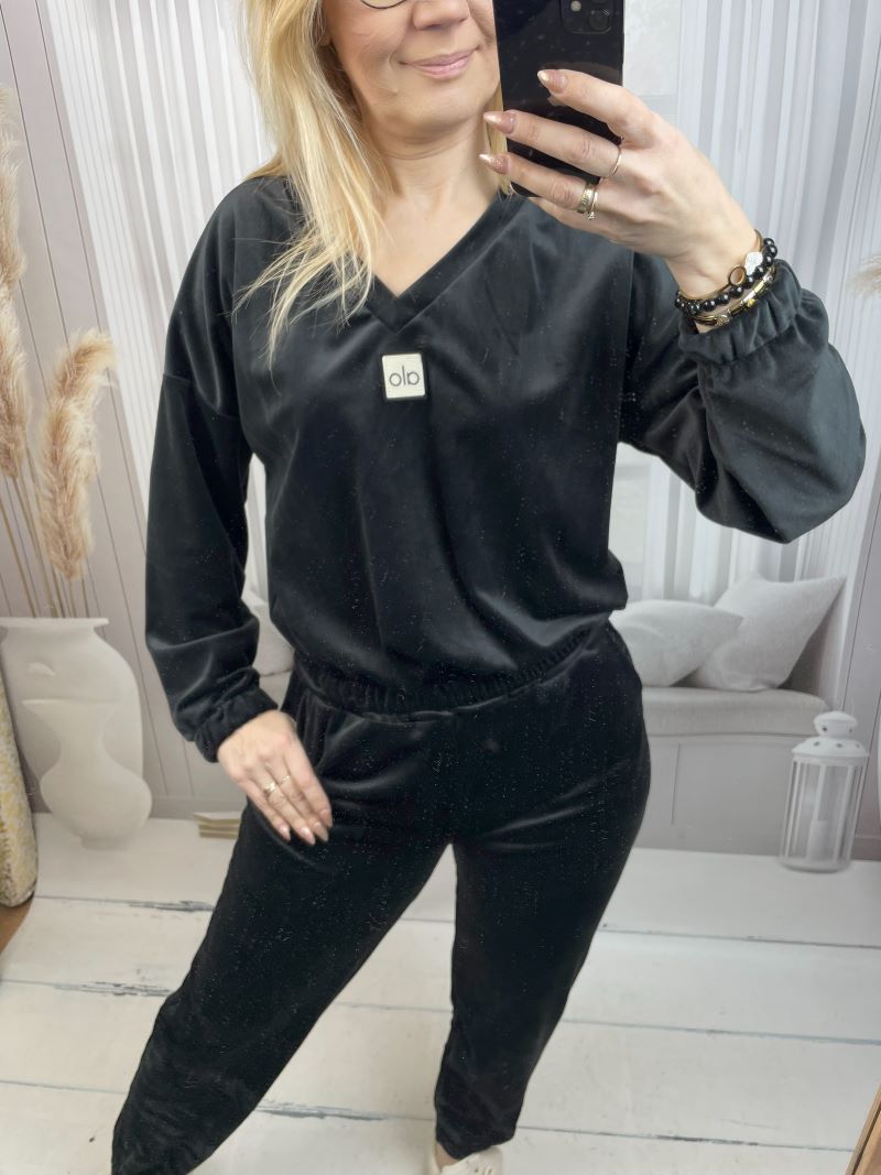 Komplet składa się z krótszej bluzy z dekoltem V, wykończonej na dole elastyczną gumą, która pięknie podkreśla talię i nadaje sylwetce proporcji. Klasyczne spodnie z wygodnym ściągaczem na dole oraz praktycznymi kieszeniami po bokach gwarantują swobodę i funkcjonalność na co dzień. Całość wykonana jest z weluru wyśmienitej jakości – niezwykle miękkiego, delikatnego i przyjemnego w dotyku, który subtelnie się mieni, dodając kompletowi eleganckiego charakteru.