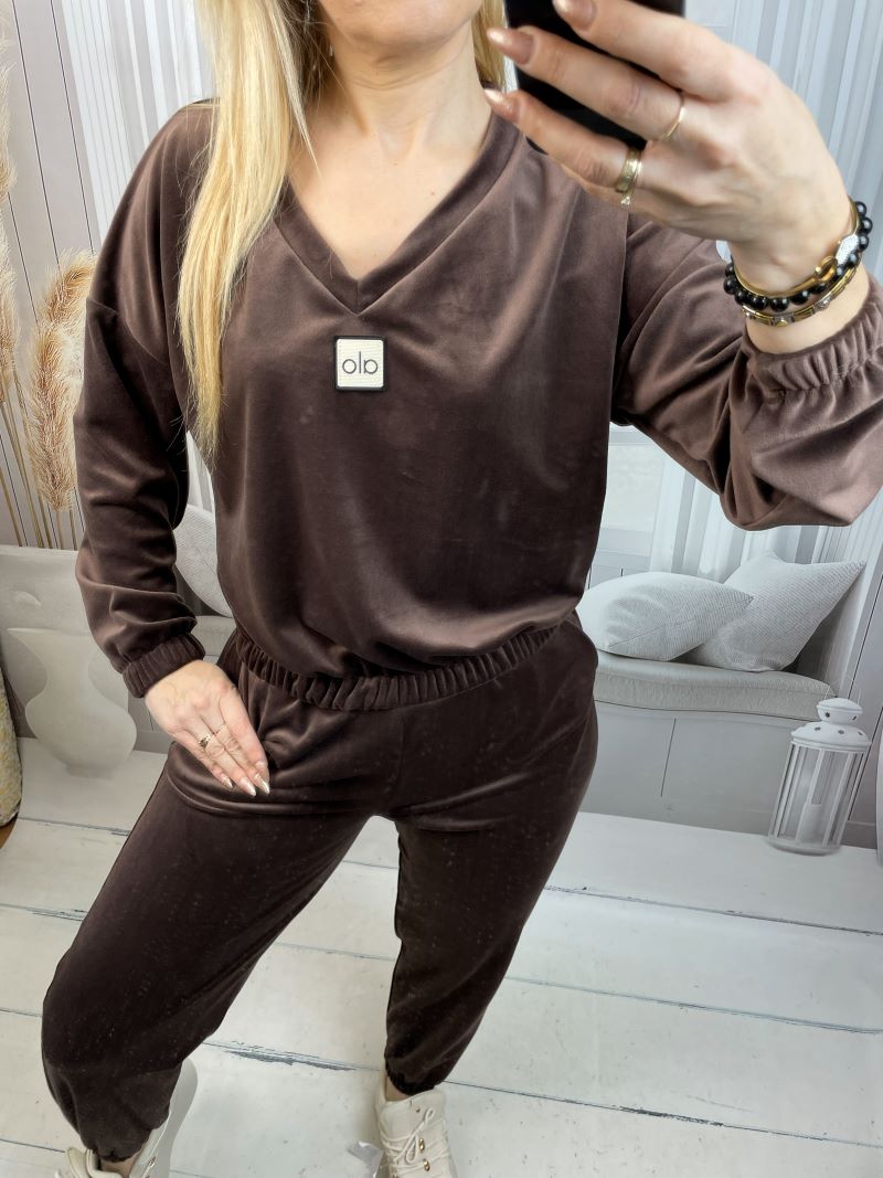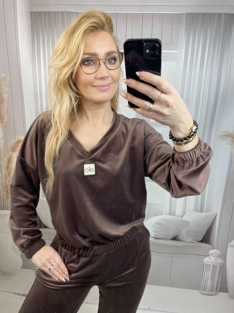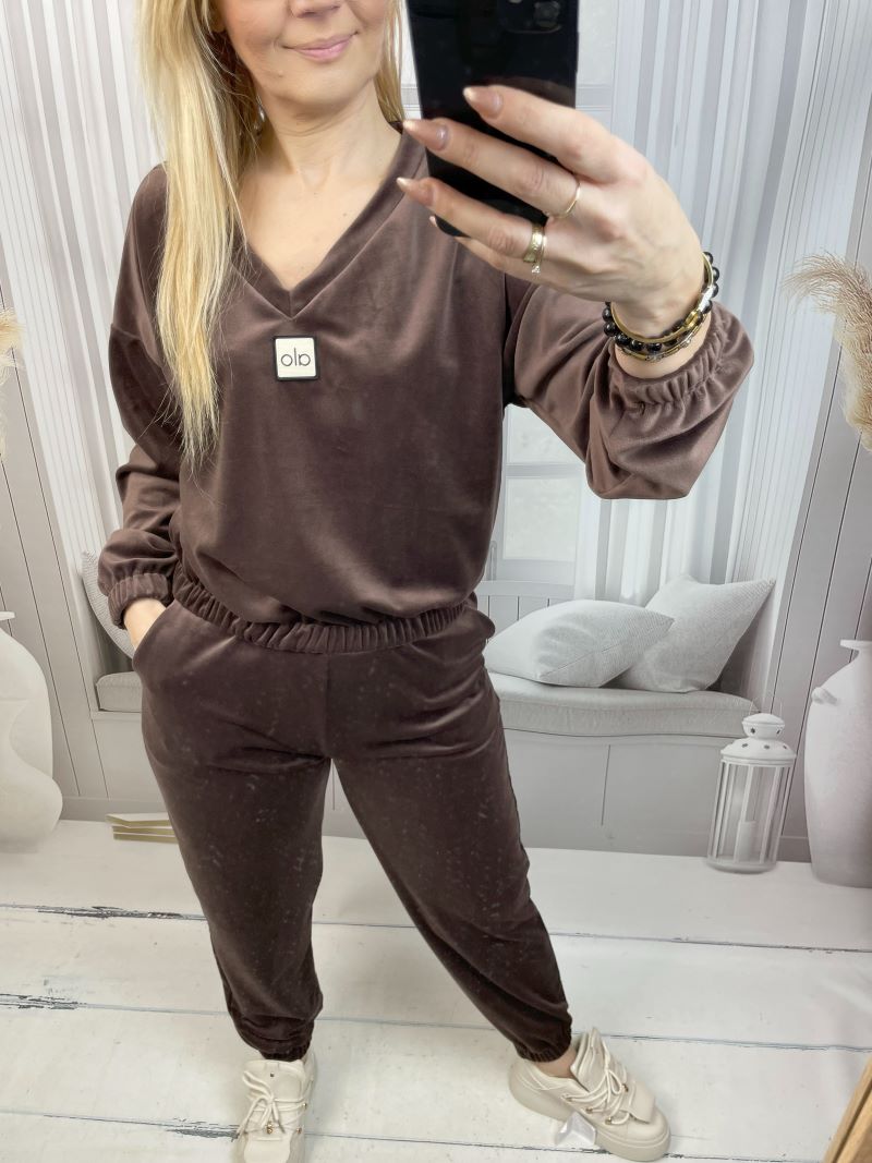 Komplet składa się z krótszej bluzy z dekoltem V, wykończonej na dole elastyczną gumą, która pięknie podkreśla talię i nadaje sylwetce proporcji. Klasyczne spodnie z wygodnym ściągaczem na dole oraz praktycznymi kieszeniami po bokach gwarantują swobodę i funkcjonalność na co dzień. Całość wykonana jest z weluru wyśmienitej jakości – niezwykle miękkiego, delikatnego i przyjemnego w dotyku, który subtelnie się mieni, dodając kompletowi eleganckiego charakteru.