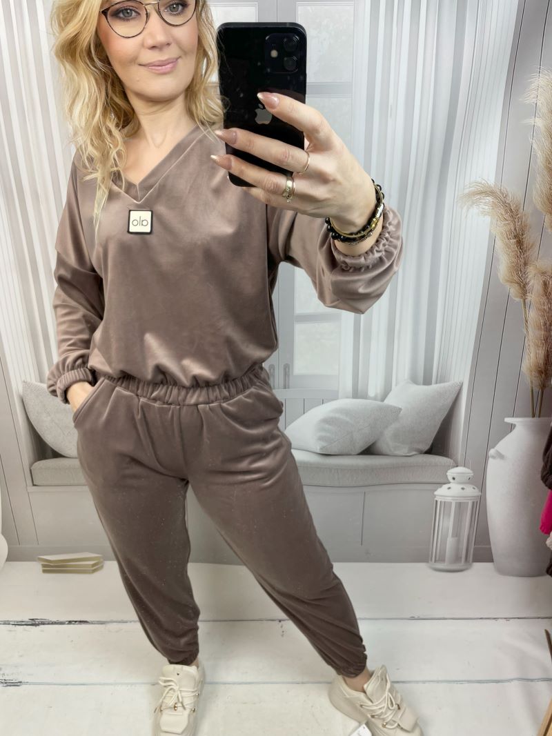 Komplet składa się z krótszej bluzy z dekoltem V, wykończonej na dole elastyczną gumą, która pięknie podkreśla talię i nadaje sylwetce proporcji. Klasyczne spodnie z wygodnym ściągaczem na dole oraz praktycznymi kieszeniami po bokach gwarantują swobodę i funkcjonalność na co dzień. Całość wykonana jest z weluru wyśmienitej jakości – niezwykle miękkiego, delikatnego i przyjemnego w dotyku, który subtelnie się mieni, dodając kompletowi eleganckiego charakteru.