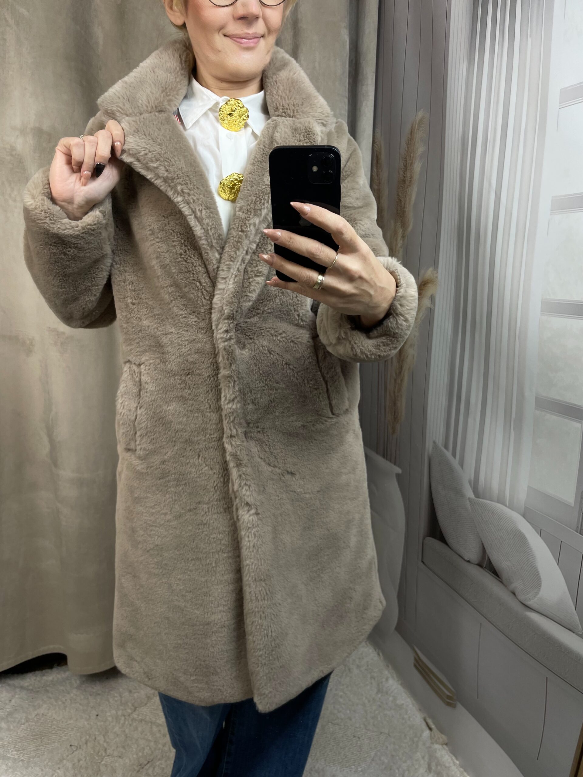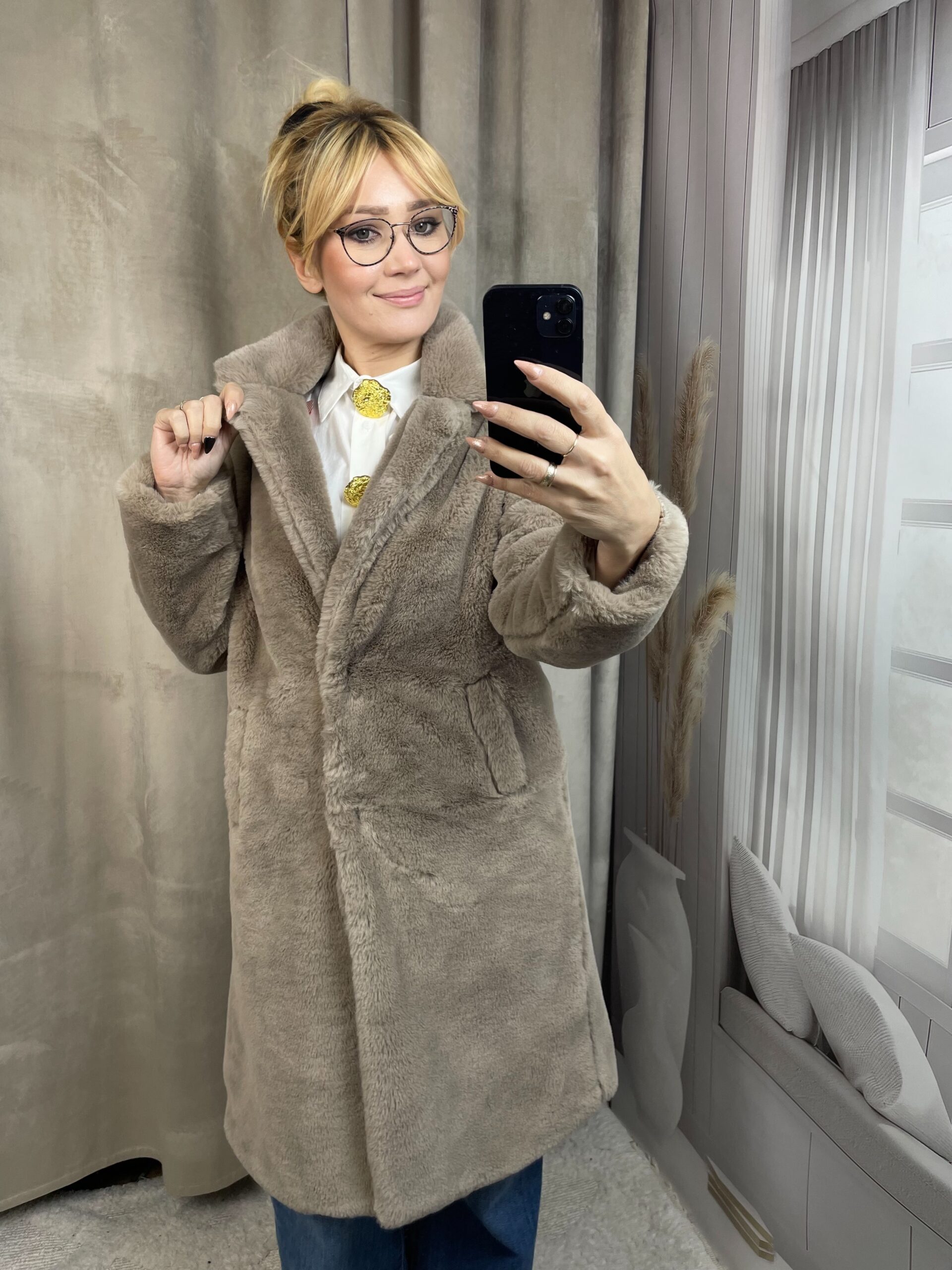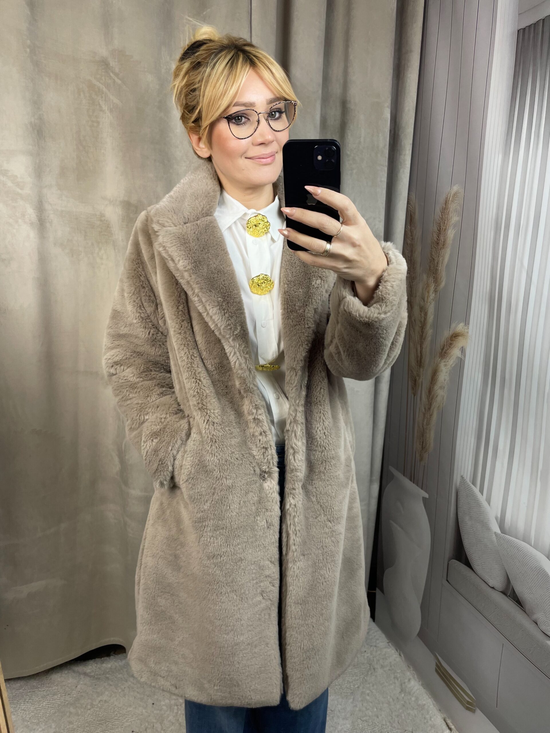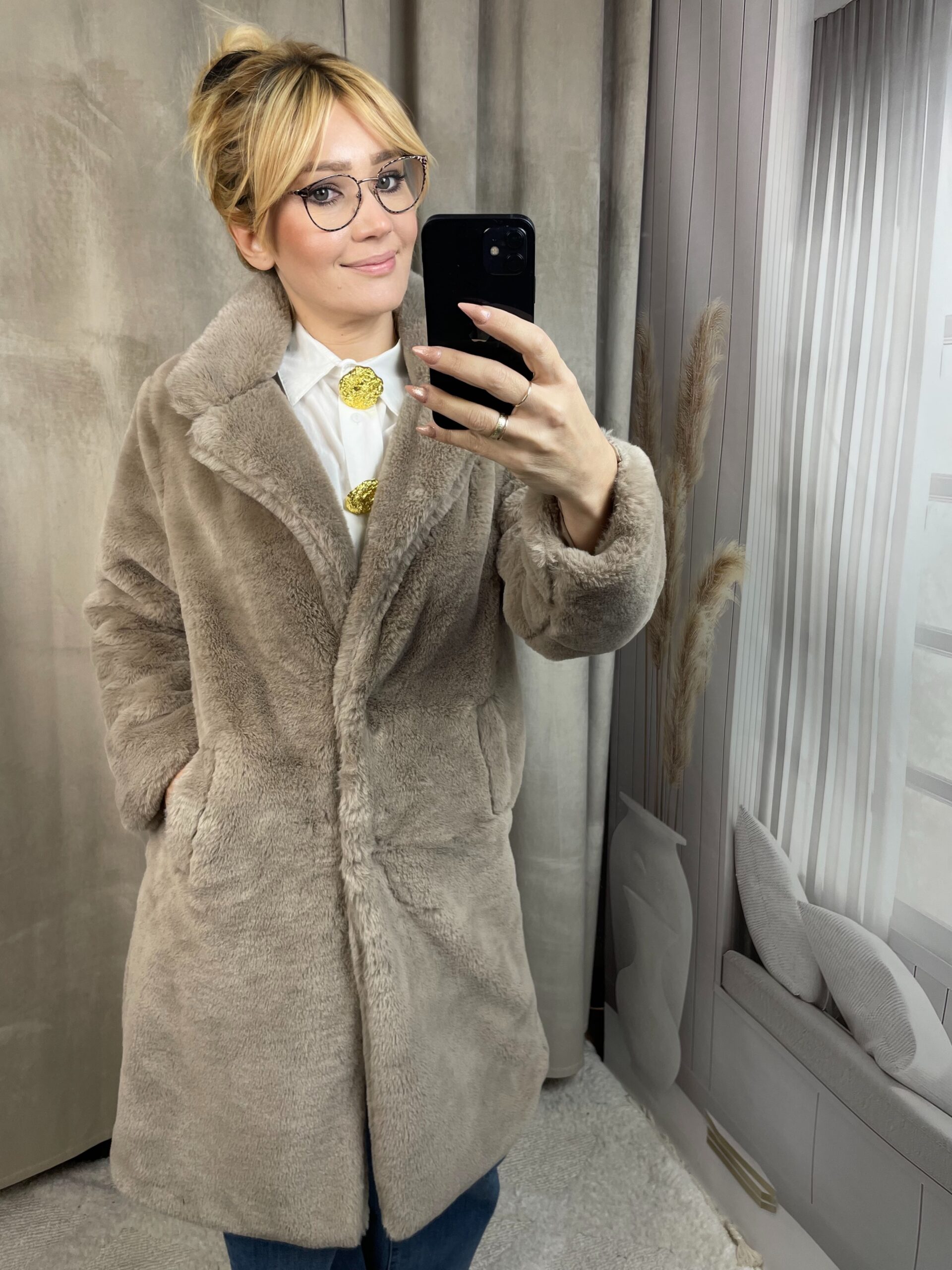 Mięciutkie futerko,niezwykle lekkie i ciepłe , to idealny wybór na jesienne chłodniejsze dni. Futerko zdobi duży , przyciągający uwagę kołnierz oraz delikatne włosie z którego jest wykonane. Ten model zapinany jest na dwie wygodne napy a po bokach znajdują się dwie poręczne kieszenie.