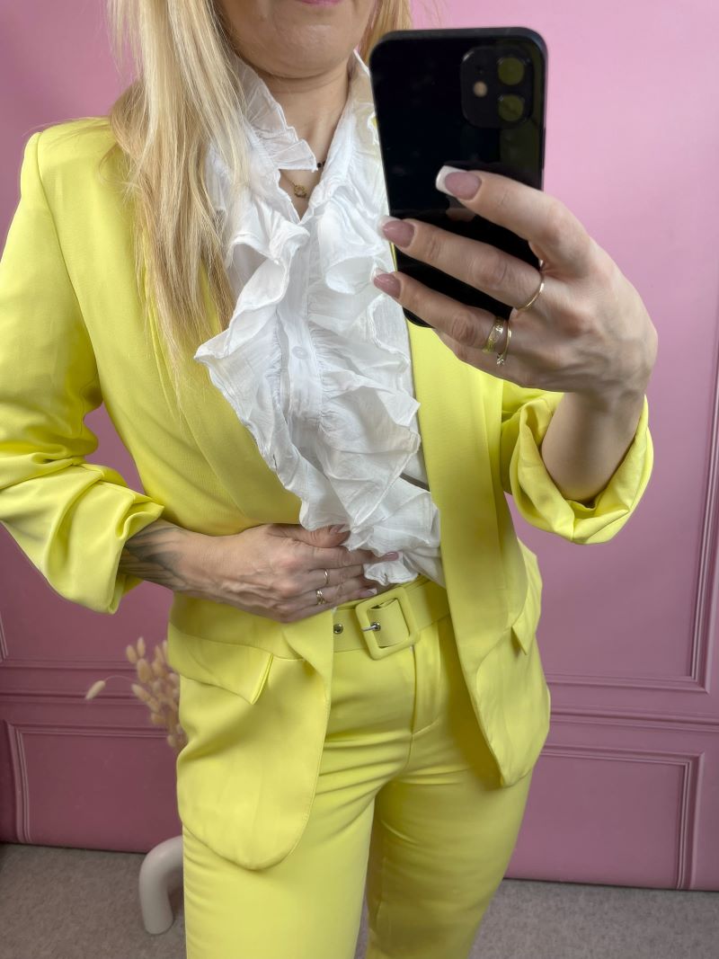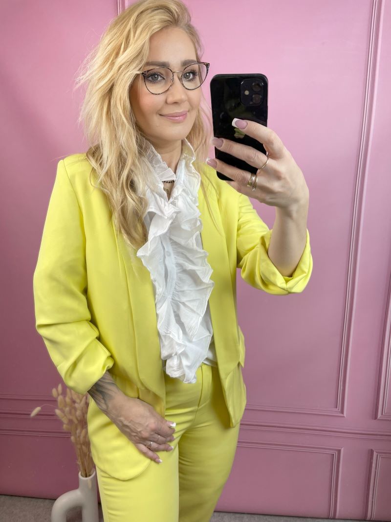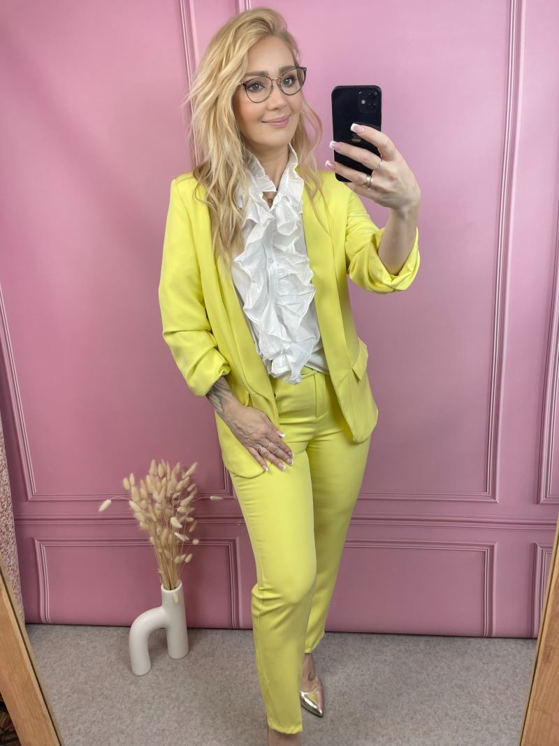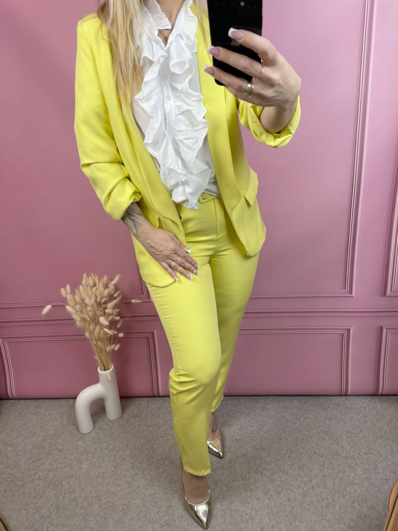 W komplecie znajdziesz spodnie typu cygaretki – ponadczasowe, kobiece i niezwykle uniwersalne. Możliwość zaprasowania ich na kant sprawia, że w jednej chwili możesz nadać stylizacji bardziej formalnego, wyrafinowanego charakteru. To detal, który robi różnicę.