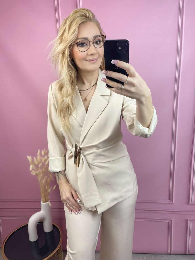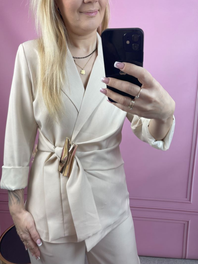 Dłuższa marynarka z klasycznym kołnierzem nadaje sylwetce szyku i ponadczasowego stylu. Jej największym atutem jest niezwykle efektowne drapowanie, ozdobione złotą klamrą, które pięknie podkreśla talię i tworzy kobiecą, harmonijną linię. To detal, który nadaje całości luksusowego charakteru i sprawia, że nie potrzebujesz wielu dodatków.