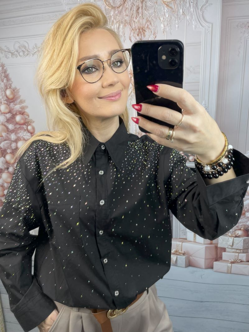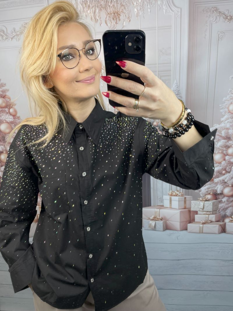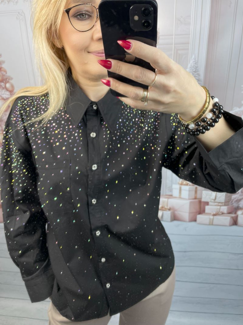 Klasyczna Koszula Oversize z Opalizującymi Cyrkoniami Czarna