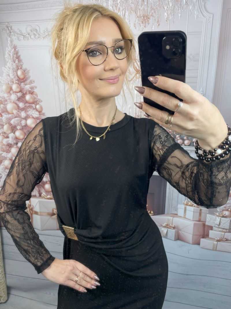 Największym atutem sukienki jest efektowne drapowanie na boku oraz koronkowy rękaw, nadaje całości eleganckiego charakteru. Ozdobna klamra dodaje stylowego akcentu, który przyciąga spojrzenia, pozostając jednocześnie gustowny i nienachalny.