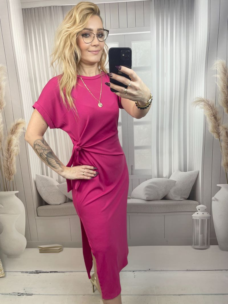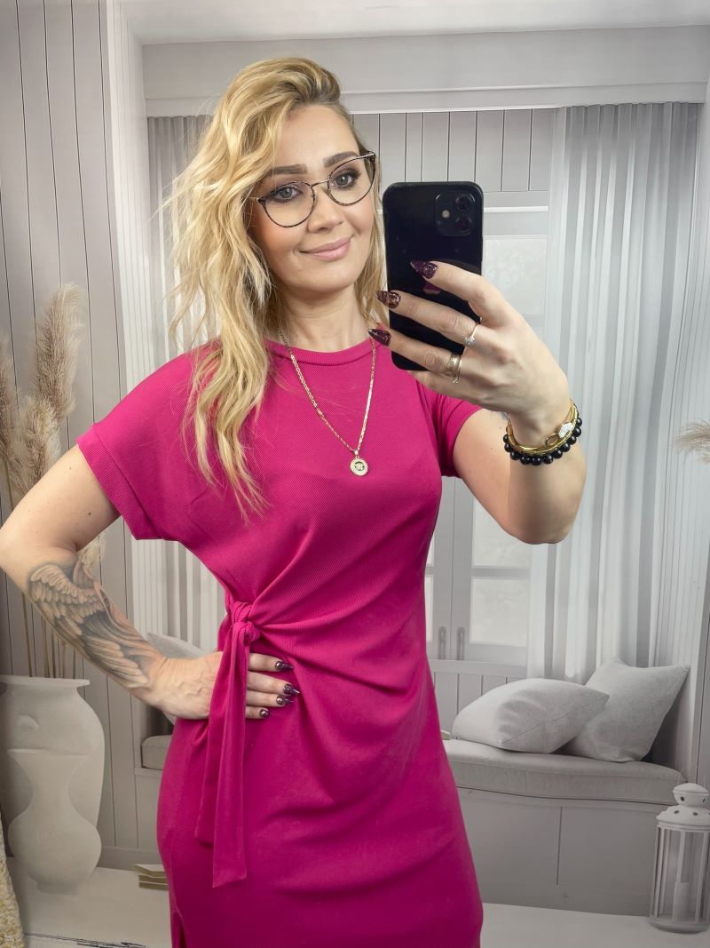 Klasyczna Sukienka Prążkowana z Wiązaniem na Boku – Fuksja S/M