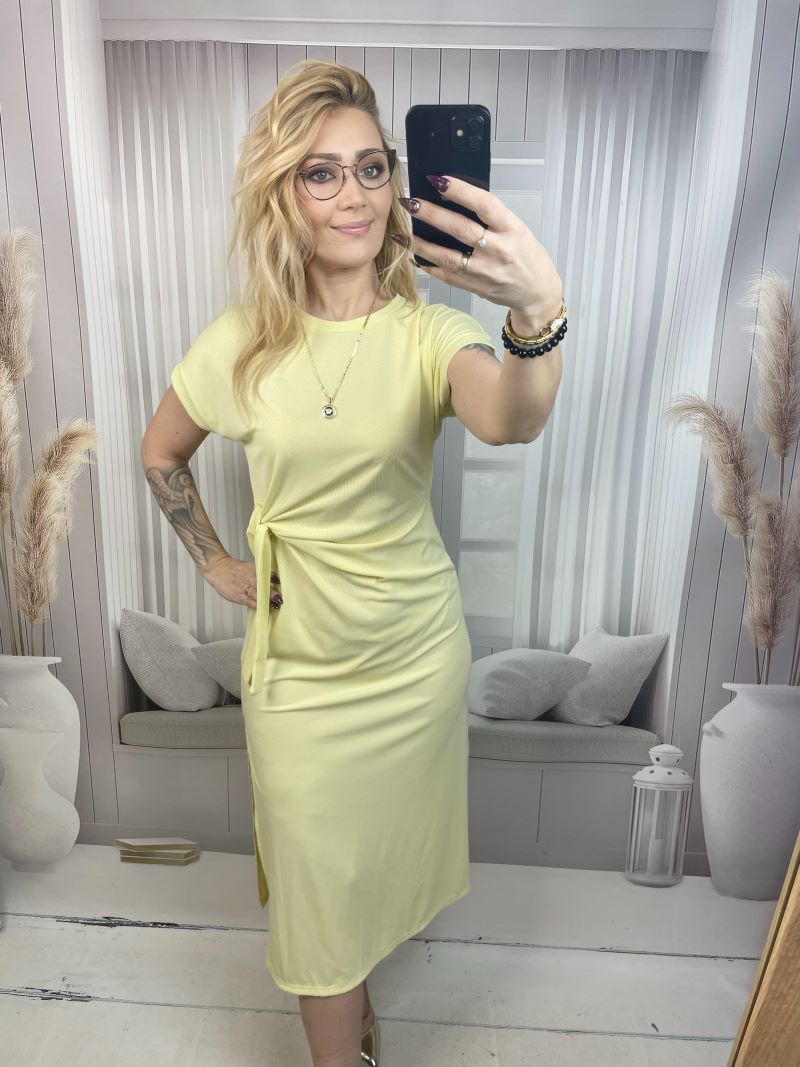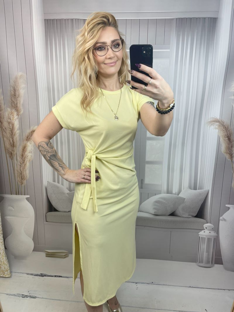 Klasyczna Sukienka Prążkowana z Wiązaniem na Boku – Żółty S/M