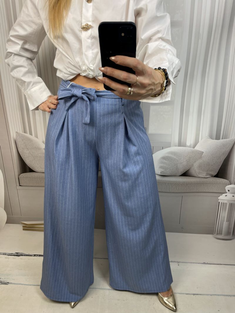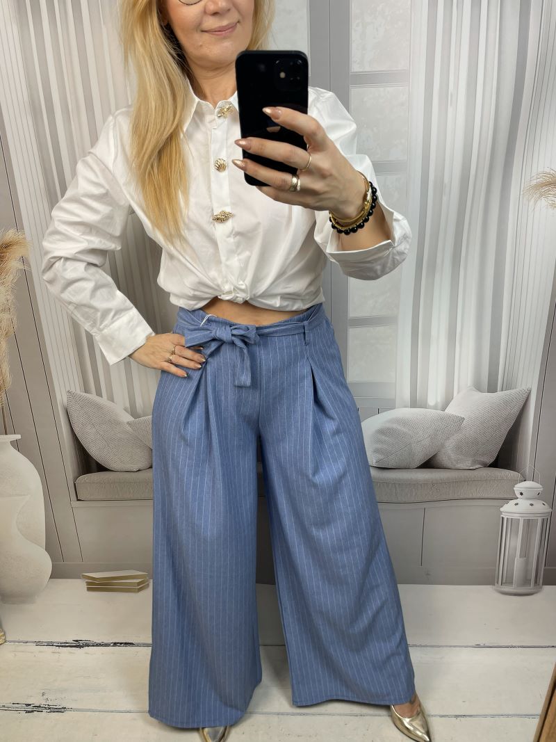 Model uszyty został z materiału premium, który doskonale się układa i zapewnia komfort noszenia. Subtelny wzór w cieniutkie paski dodaje całości lekkości i optycznie wydłuża sylwetkę. Zakładki z przodu pięknie modelują talię i biodra, podkreślając kobiece proporcje. Dodatkowym atutem jest materiałowy pasek, który można przewiązać w efektowną, ozdobną kokardę – detal nadający stylizacji romantycznego i bardzo eleganckiego charakteru.