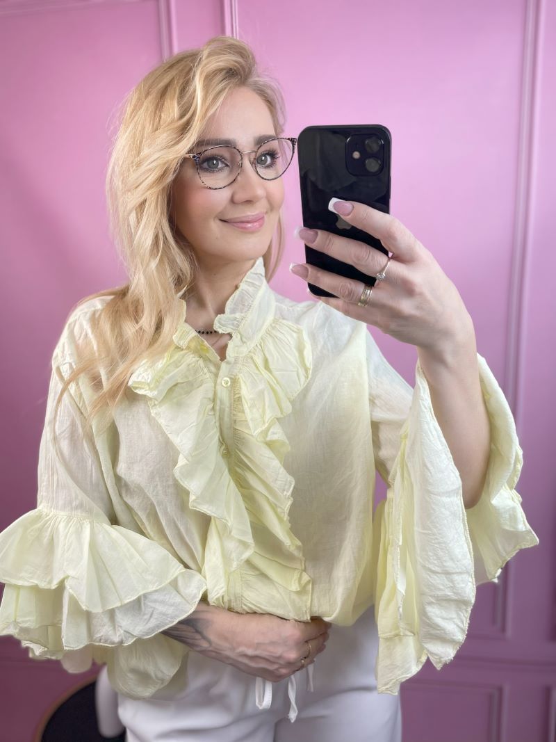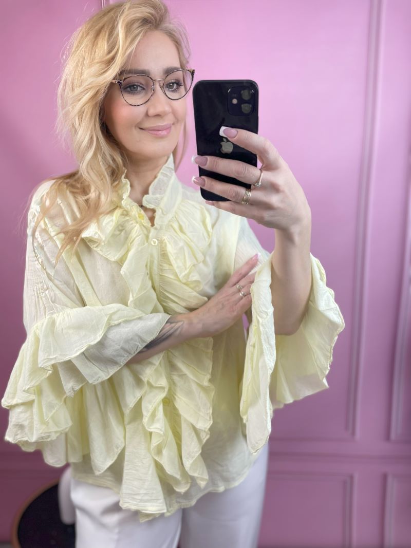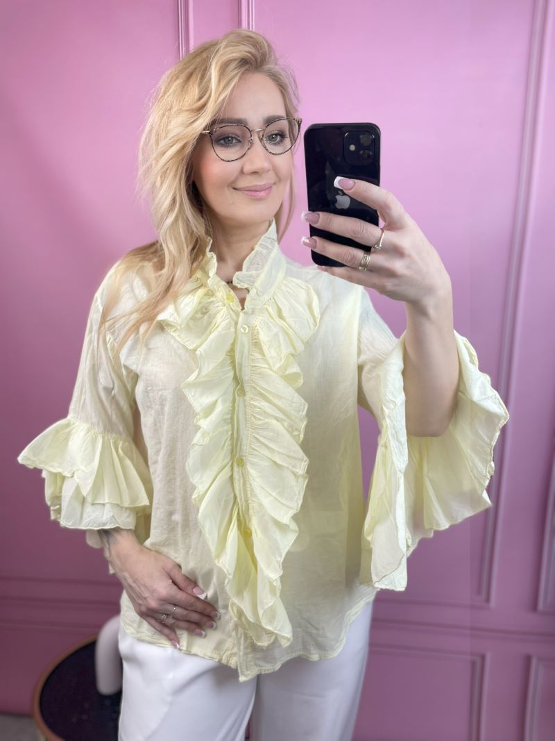 Koszula Bawełniana z Żabotem – Pastelowy Żółty