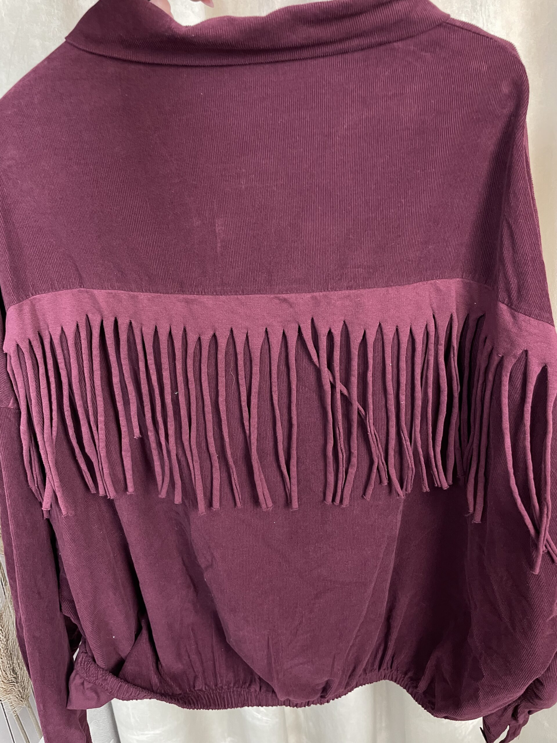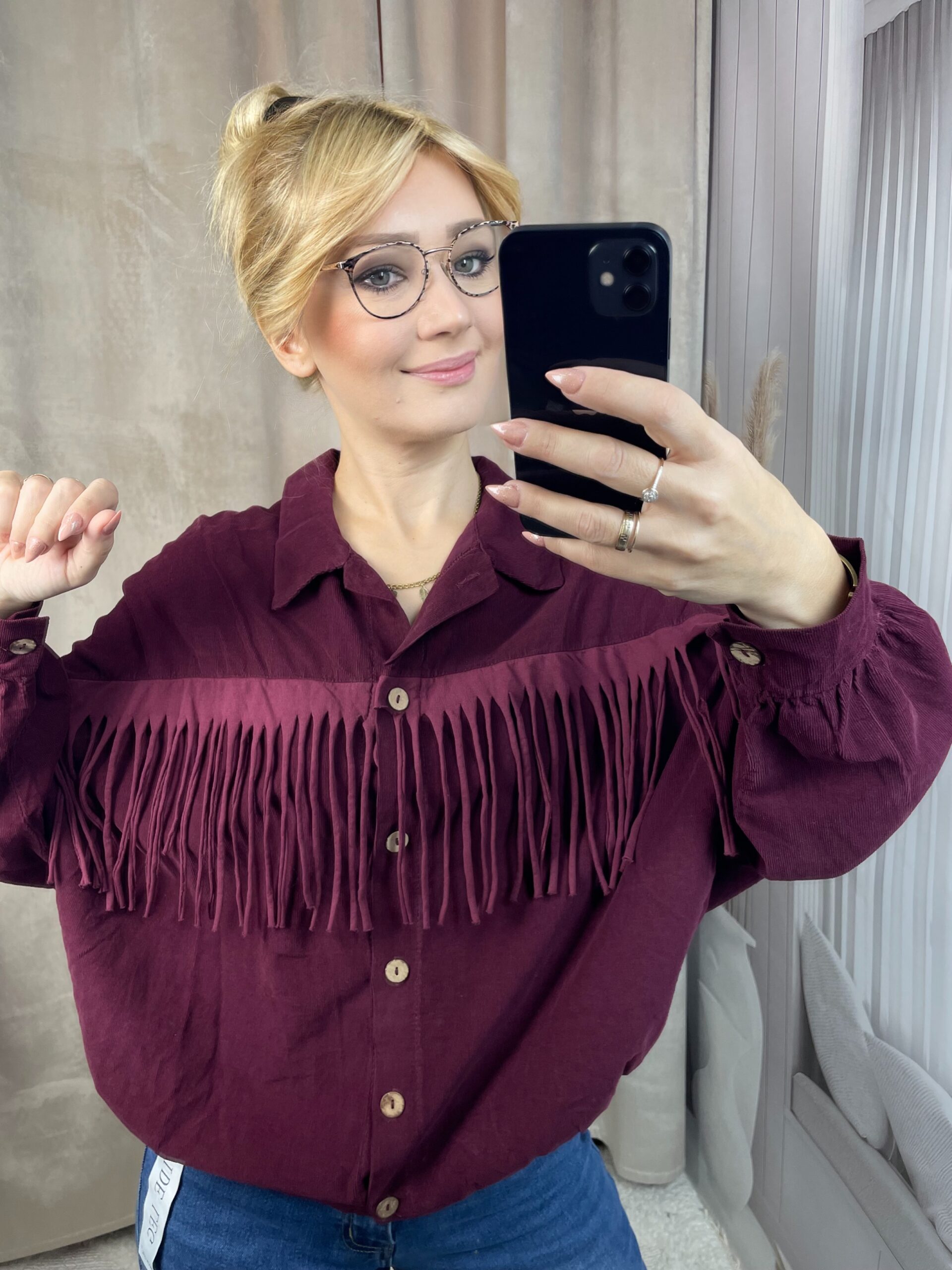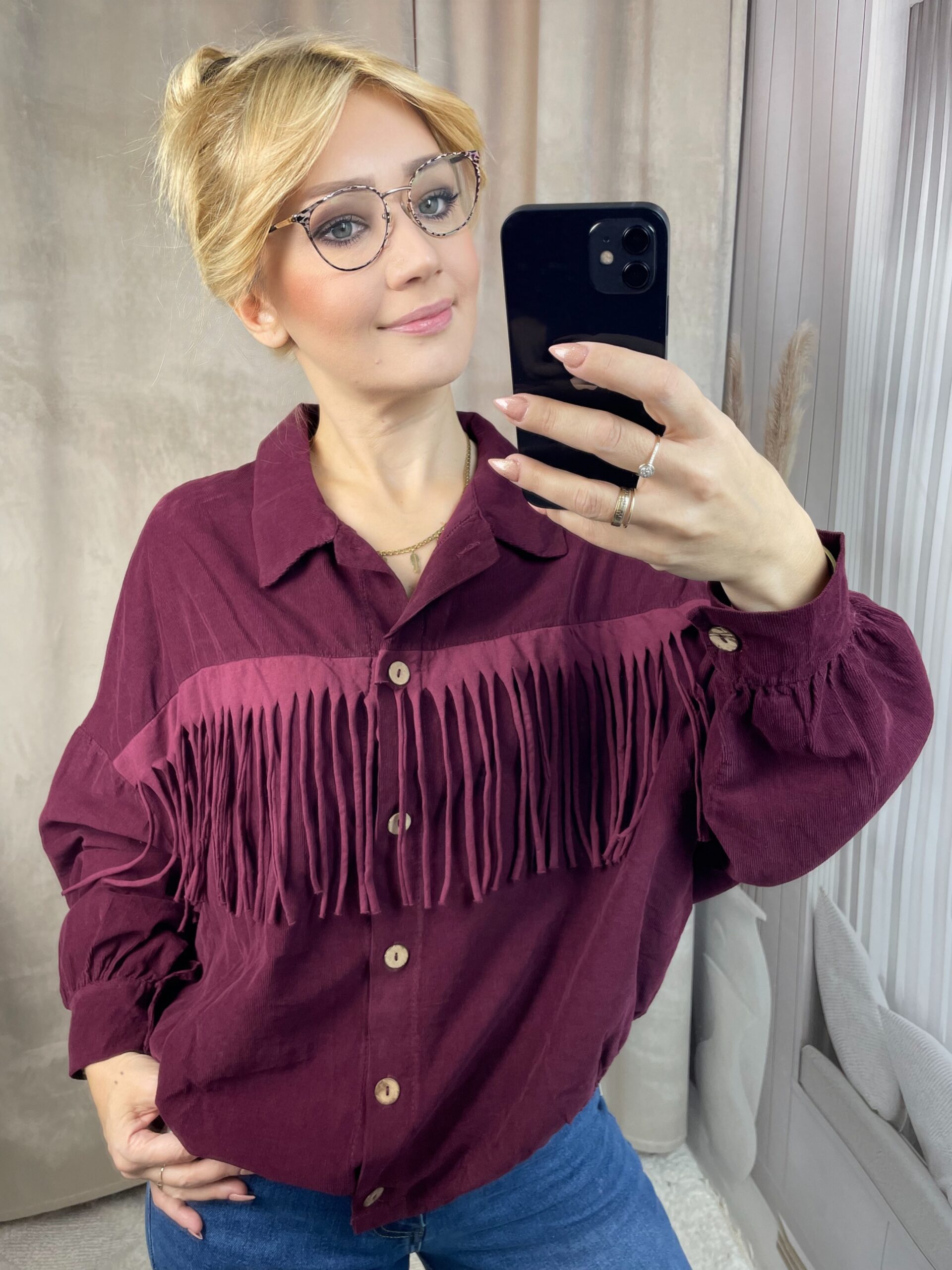 Koszula z cienkiego sztruksu, zdobiona frędzlami to idealny element garderoby dla kobiet lubiących bawić się modą. Koszula dzięki lekkiej tkaninie i niebanalnemu fasonowi ,świetnie sprawdzi się, zarówno w casualowych jak i w codziennych stylizacjach.