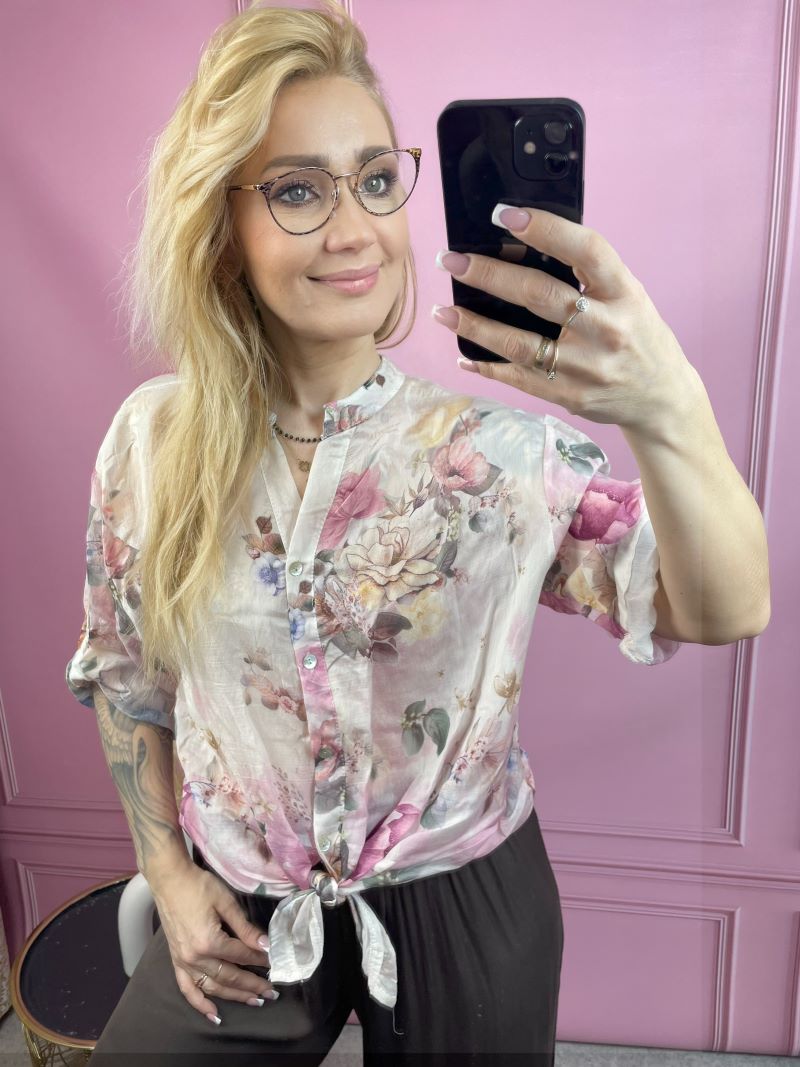 Koszula zapinana na guziki, wykończona stylową stójką, pięknie eksponuje szyję i nadaje całości nowoczesnego charakteru. Jej największym wyróżnikiem jest przepiękny, kolorowy wzór kwiatowy, który przyciąga spojrzenia i wprowadza świeżość do każdej stylizacji.