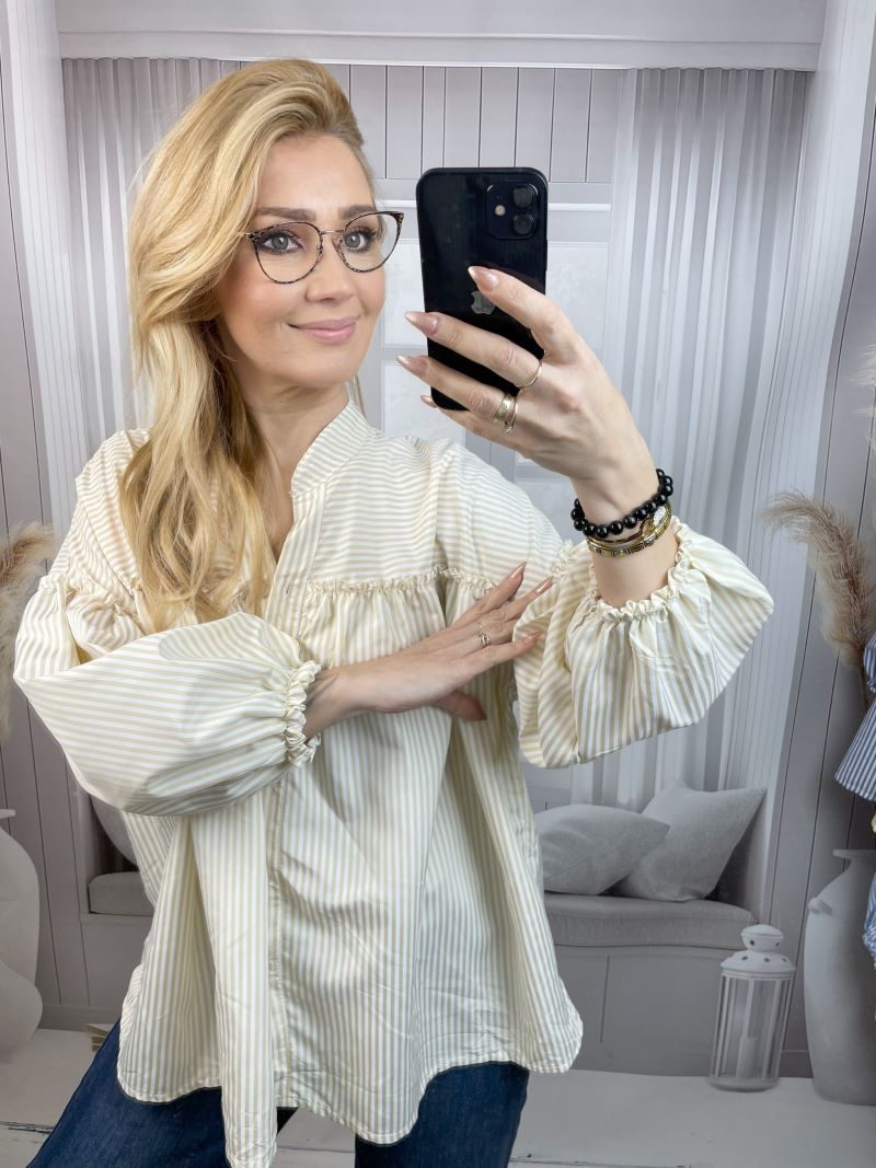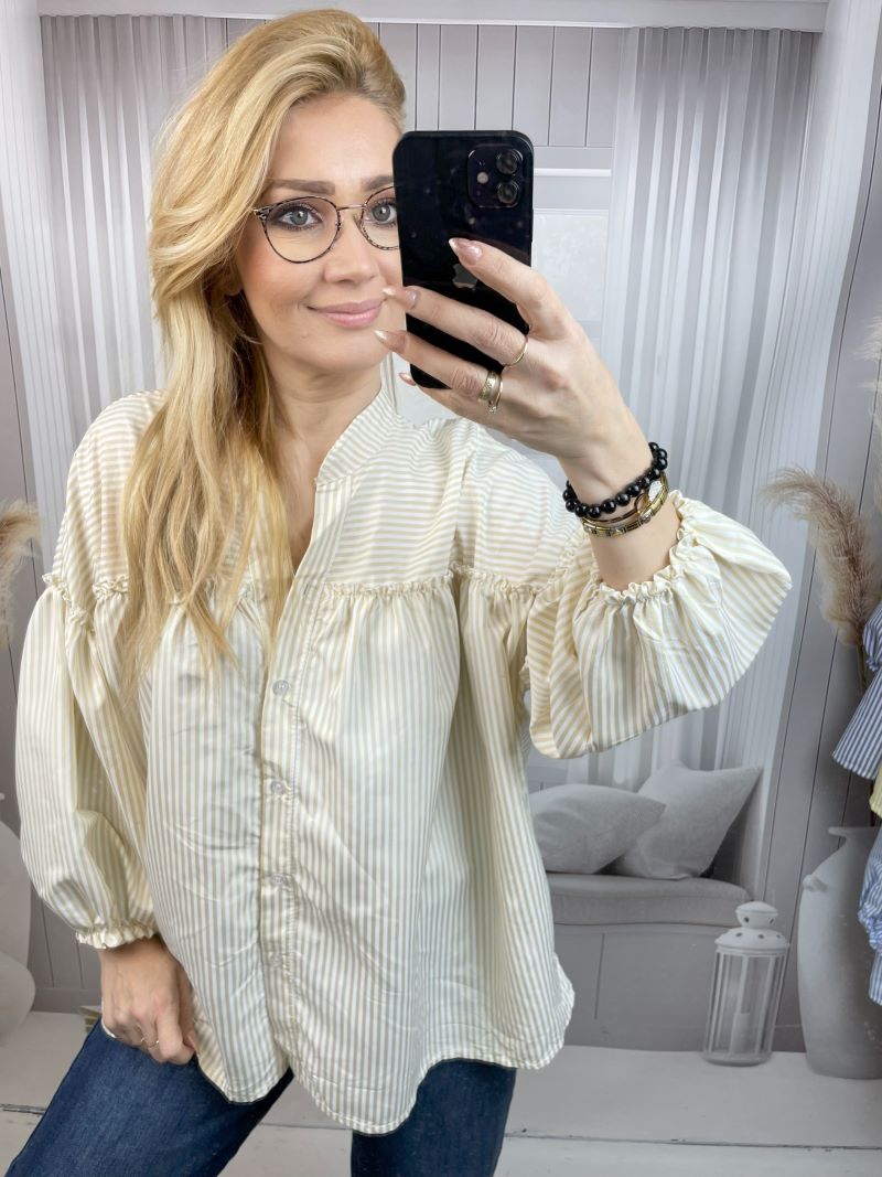 Koszula w Paski z Balonowym Rękawem Beż