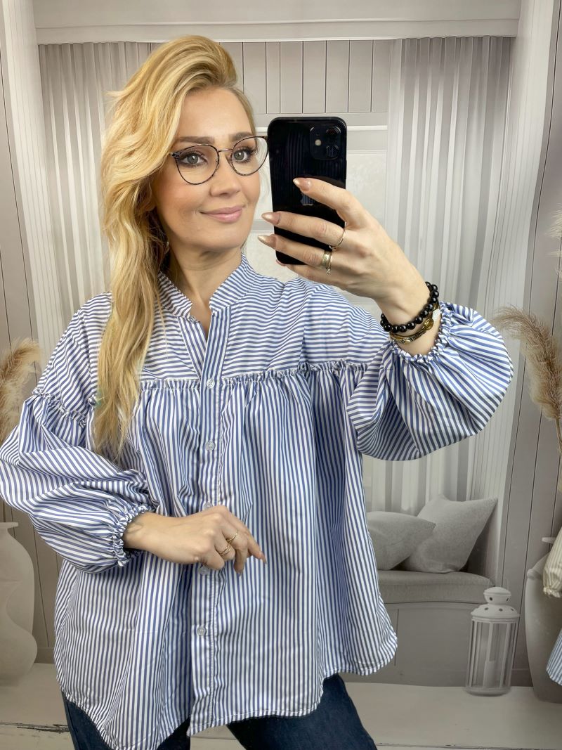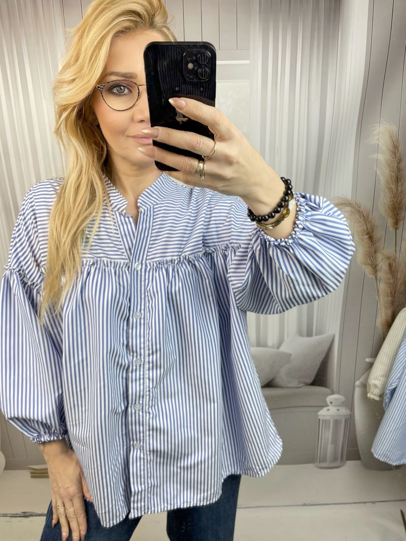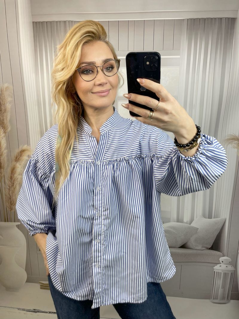 Koszula w Paski z Balonowym Rękawem Niebieska