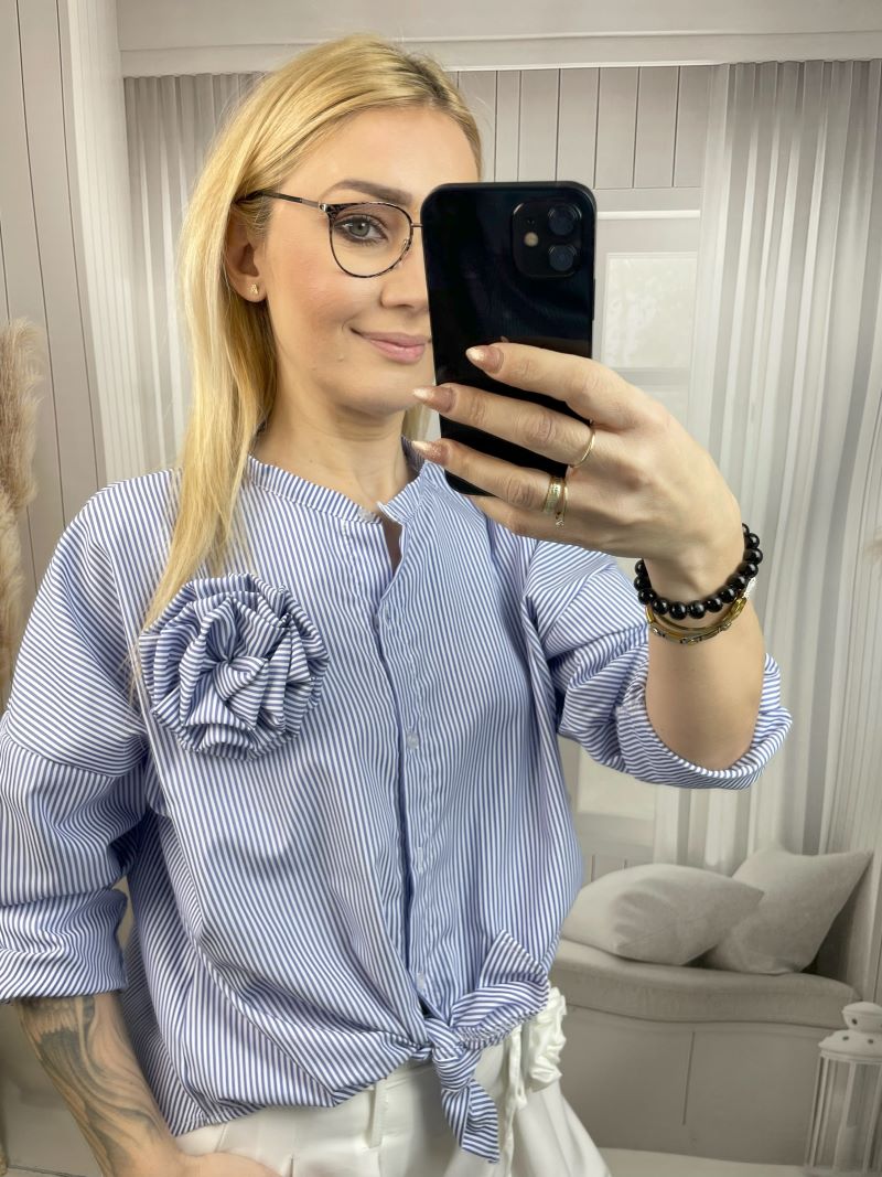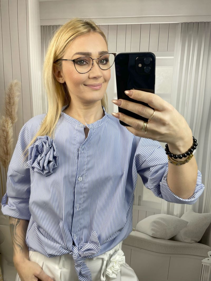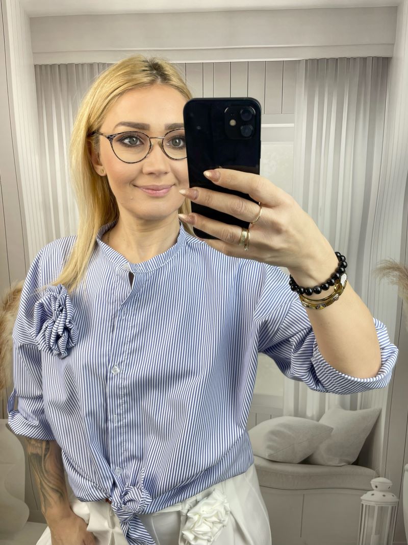 Koszula ma elegancką stójkę, która pięknie wysmukla szyję i nadaje całości nowoczesnego, szykownego wyglądu. Do tego praktyczny podpinany rękaw — idealny, gdy chcesz szybko zmienić styl z eleganckiego na bardziej casualowy.