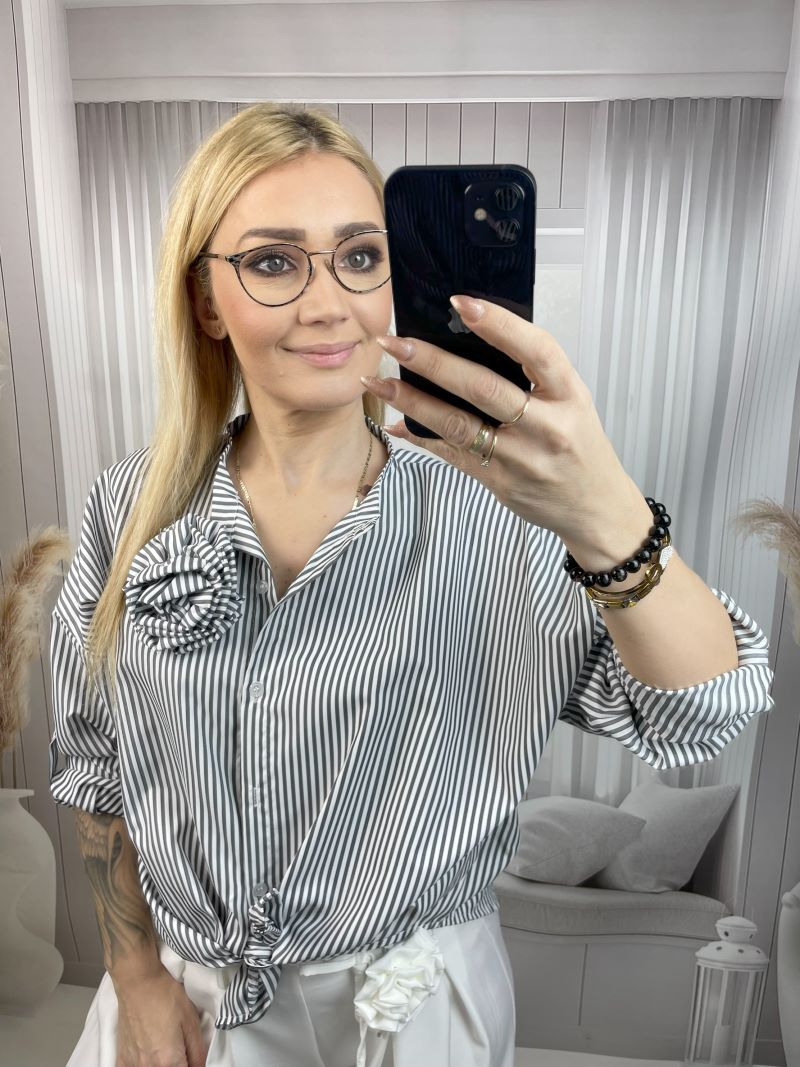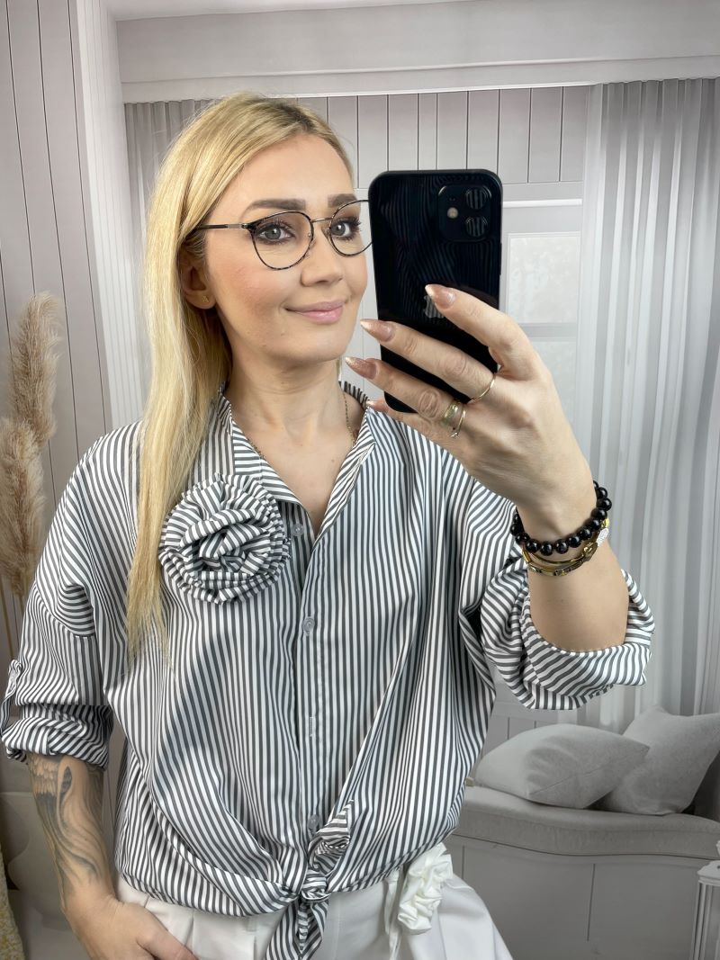 Koszula w Paski z Broszką z Różaną – Szara