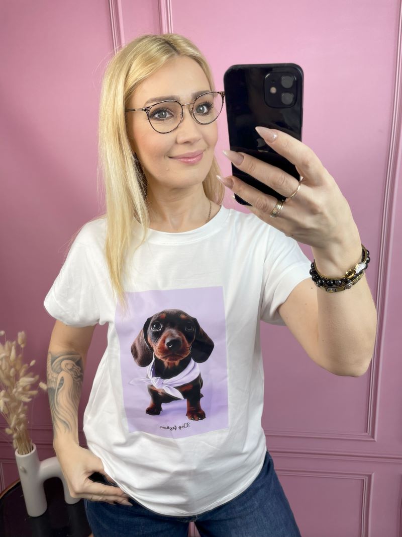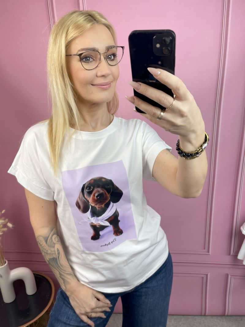 Największą ozdobą modelu jest kolorowy motyw pieska na przodzie, który dodaje koszulce wyjątkowego charakteru i sprawia, że stylizacja staje się radosna, oryginalna i przyciąga spojrzenia.