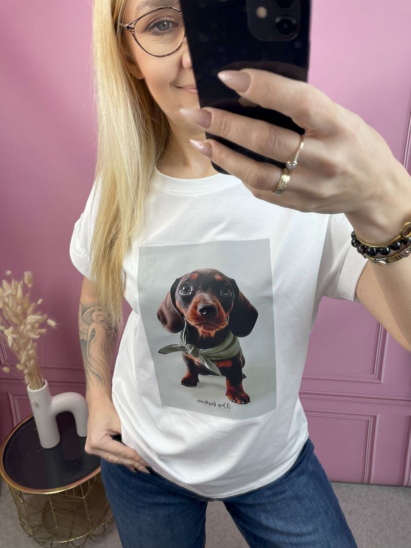 Największą ozdobą modelu jest kolorowy motyw pieska na przodzie, który dodaje koszulce wyjątkowego charakteru i sprawia, że stylizacja staje się radosna, oryginalna i przyciąga spojrzenia.