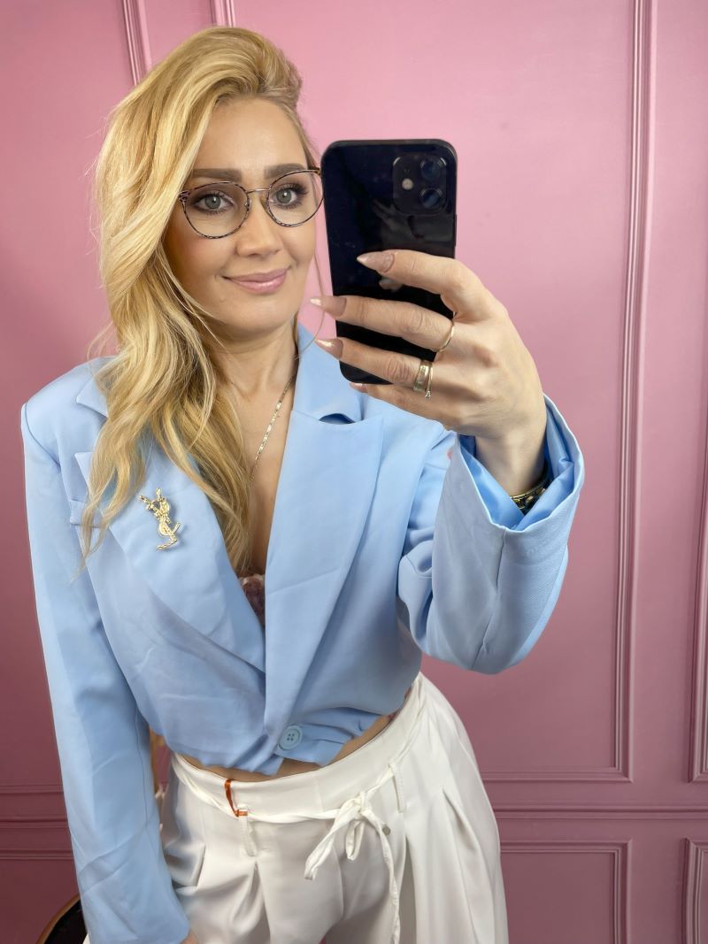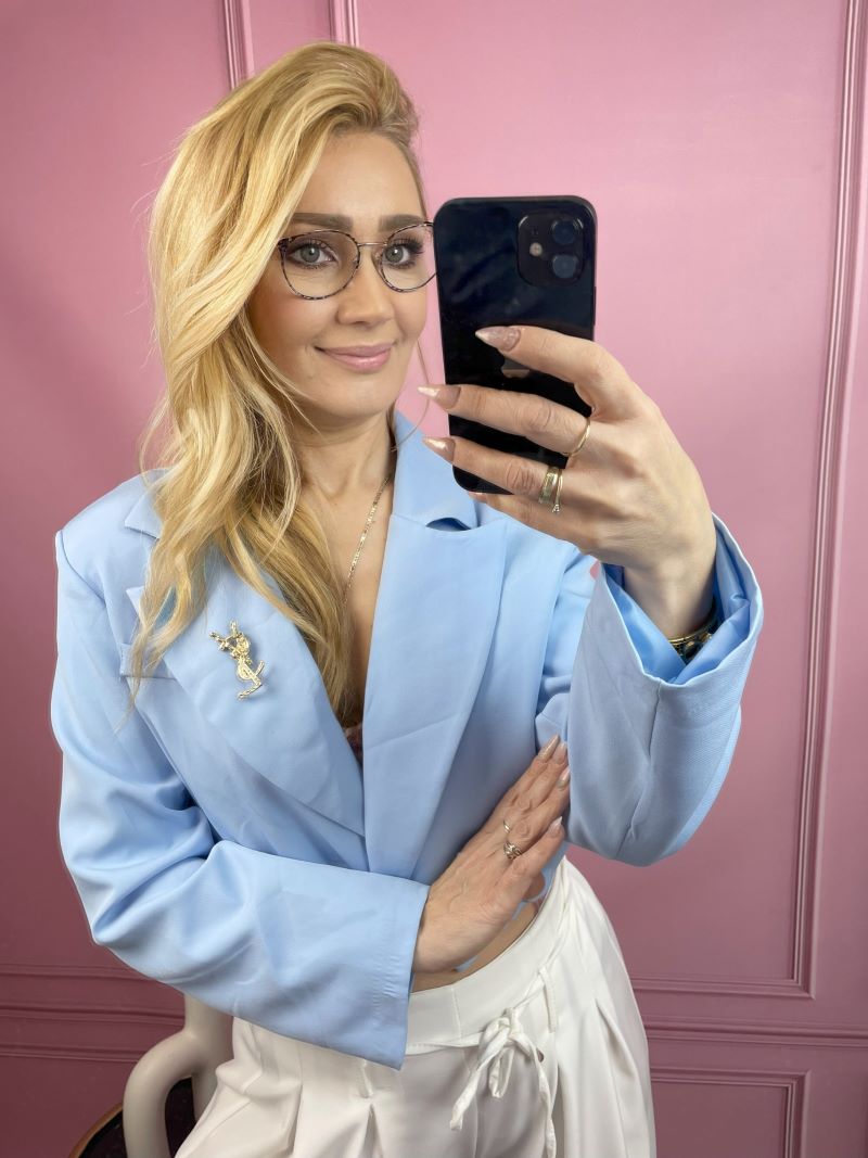 Na przodzie znajdują się klasyczne klapy, które wprowadzają elegancki akcent, przełamany sportową formą kroju. Całość dopełnia przepiękna złota broszka, która dodaje szyku i sprawia, że model przyciąga spojrzenia. Marynarka zapinana jest na jeden guzik, co podkreśla jej minimalistyczny, a zarazem bardzo modny charakter.