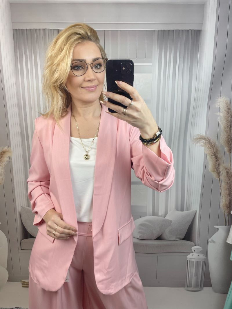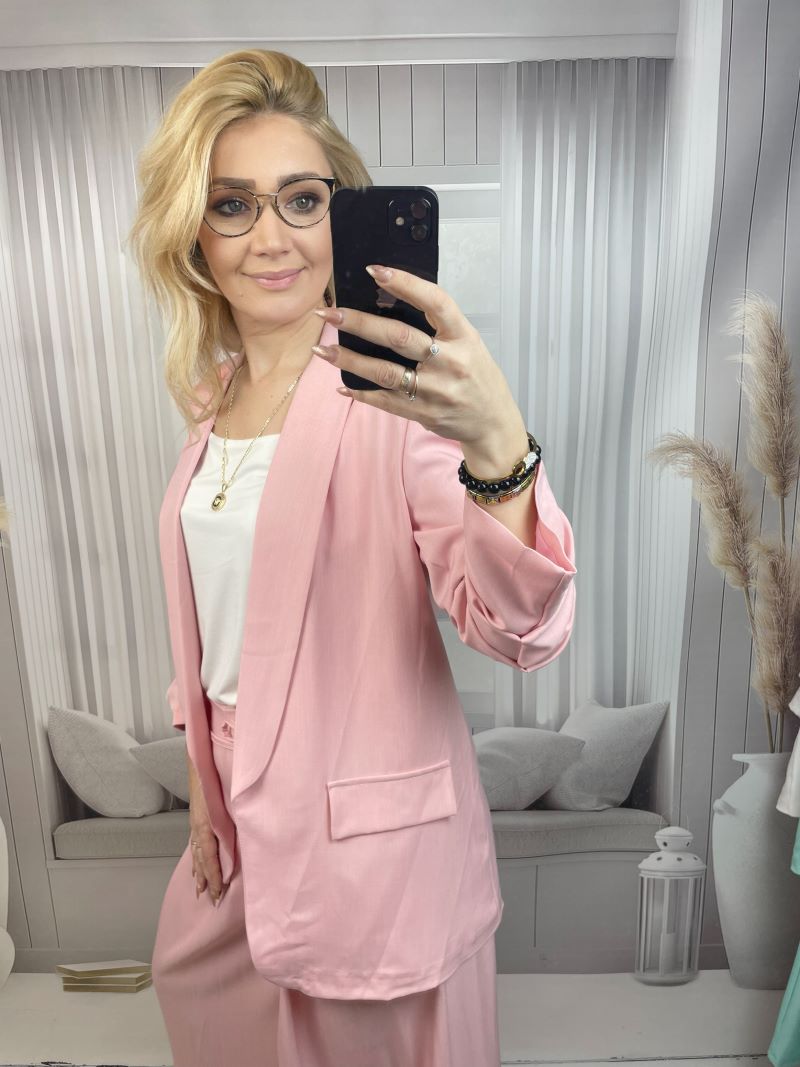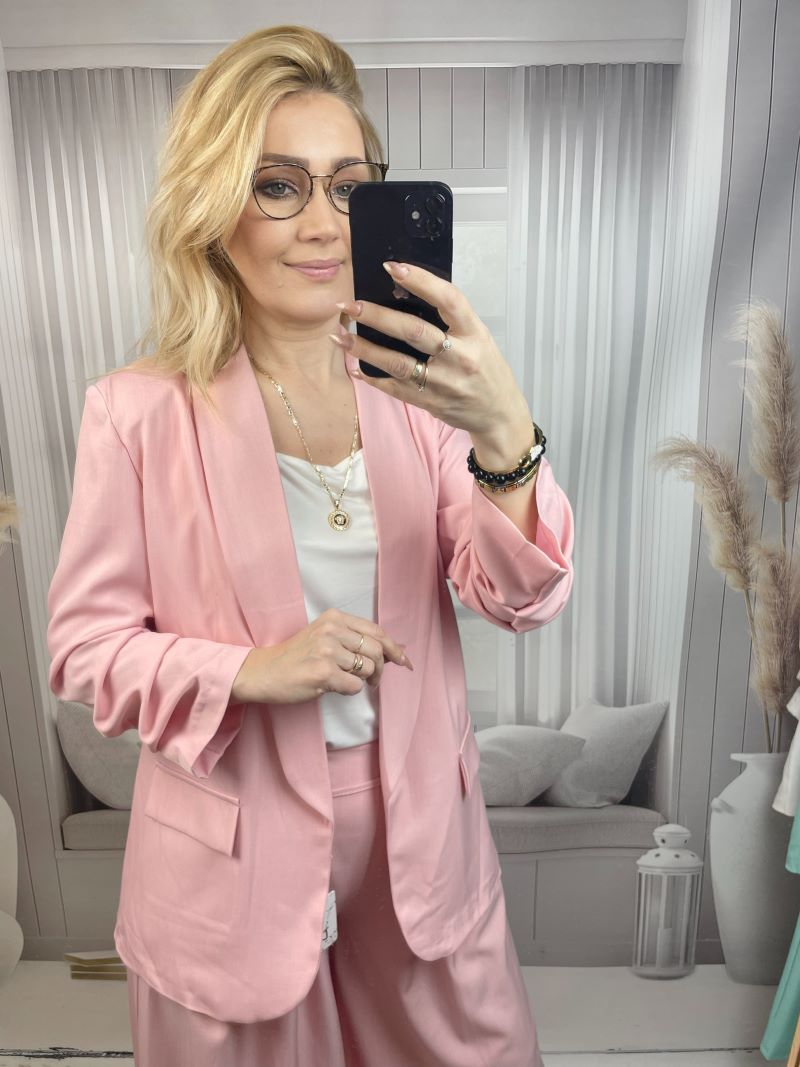 Model zachwyca luźniejszym fasonem oversize, który pięknie układa się na sylwetce i pasuje do wielu stylizacji. Rękaw 3/4, delikatnie marszczony, dodaje lekkości i kobiecego charakteru, a jednocześnie świetnie eksponuje nadgarstki (idealnie do zegarka lub bransoletek). Po bokach znajdują się ozdobne patki, które podkreślają klasyczną formę żakietu i nadają mu eleganckiego wykończenia.