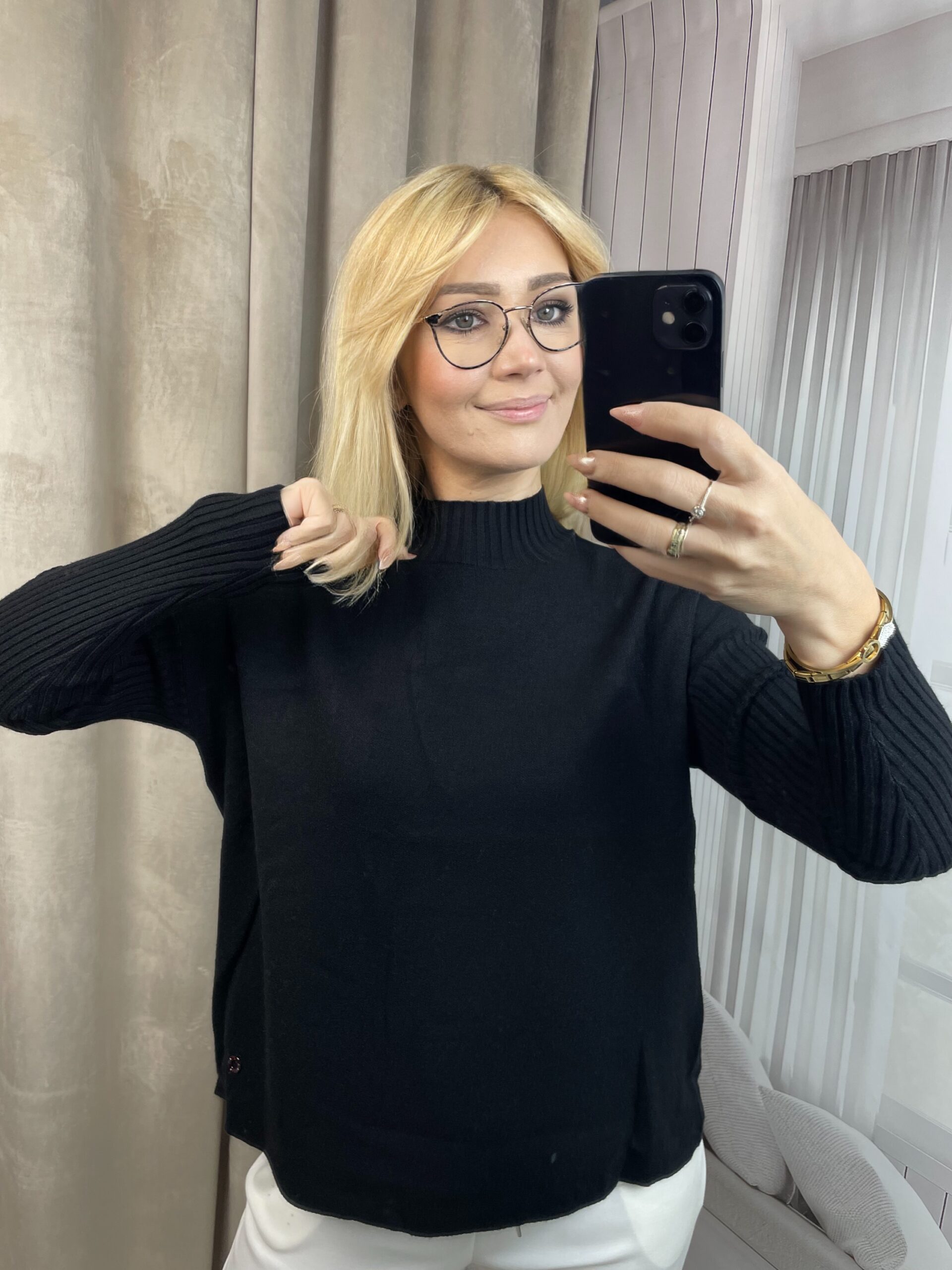 Prześliczny półgolf ,wykonany z domieszką wełny, kaszmiru i wiskozy która zapewnia komfort noszenia. Głównym elementem ozdobnym są długie ściągacze na rękawach, oraz luźny pudełkowy krój.