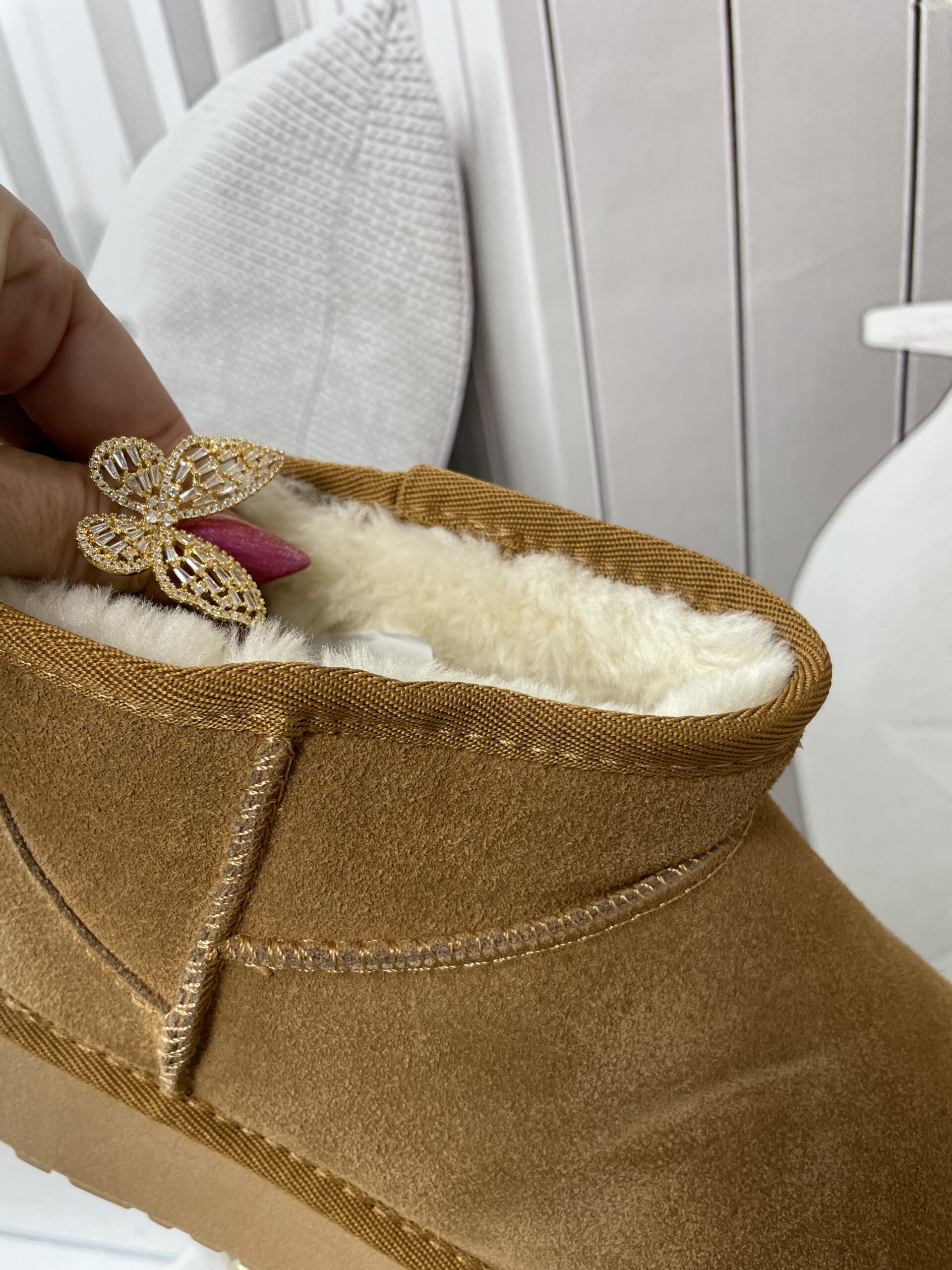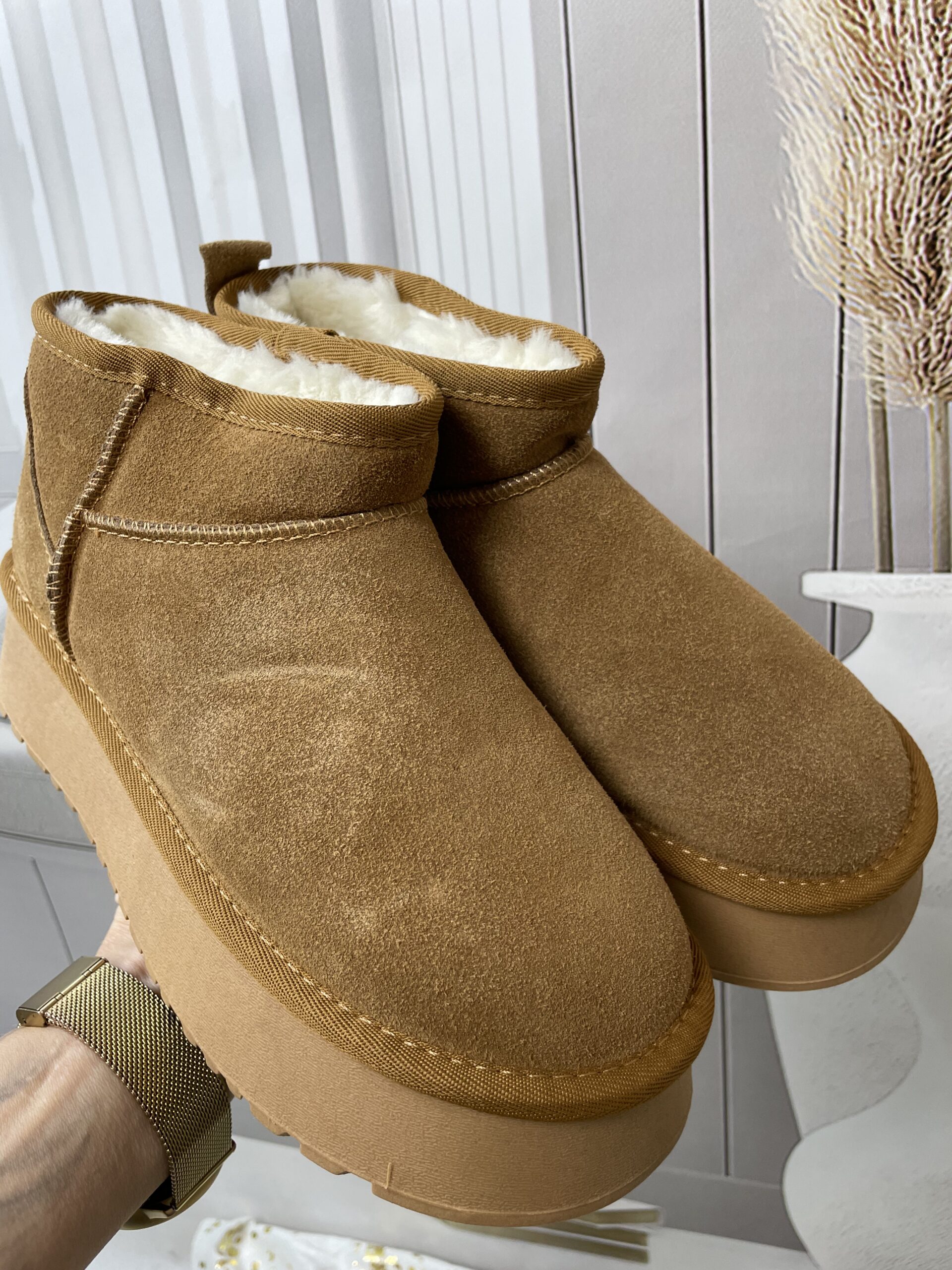 Karmelowe śniegowce z niską cholewka wykonane ze skóry zamszowej to doskonałe połączenie wygody i stylu.Płaska gruba podeszwa ,idealnie sprawdzi się na co dzień , do niemal każdej stylizacji. Taki model śniegowców to must-have w każdej szafie każdej kobiety .