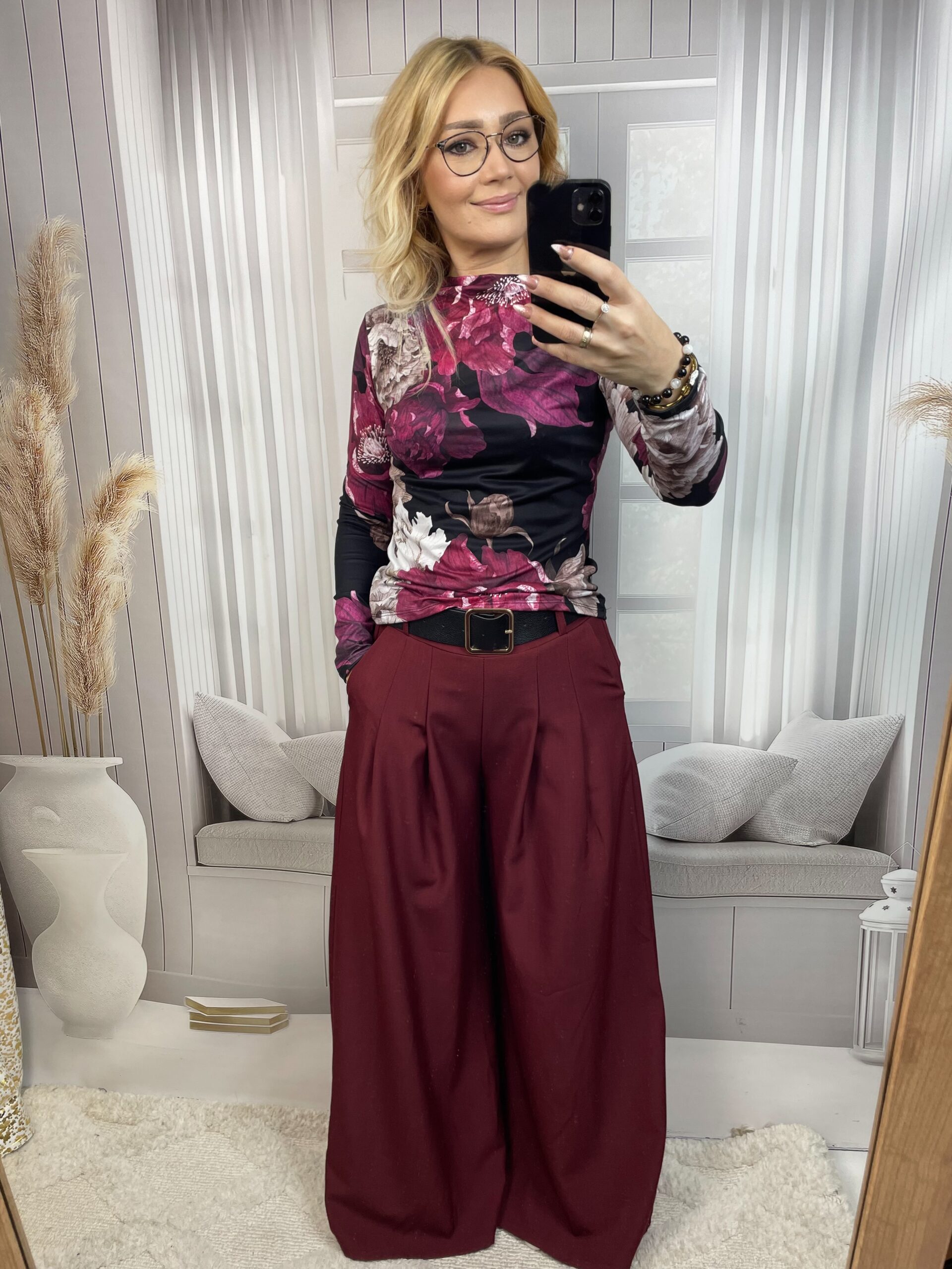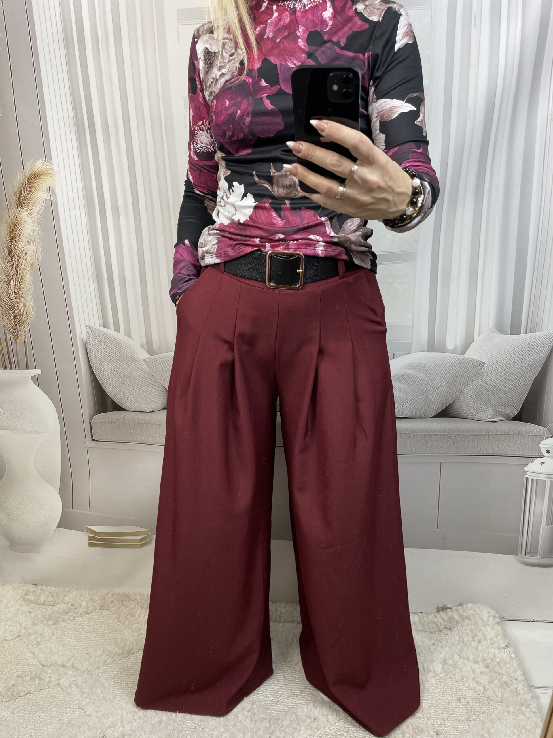 W zestawie znajduje się dopasowany pasek, który podkreśla talię i pozwala dopasować spodnie do figury. To model, który sprawdzi się zarówno w eleganckiej stylizacji do pracy, jak i w codziennym looku z koszulą lub swetrem.