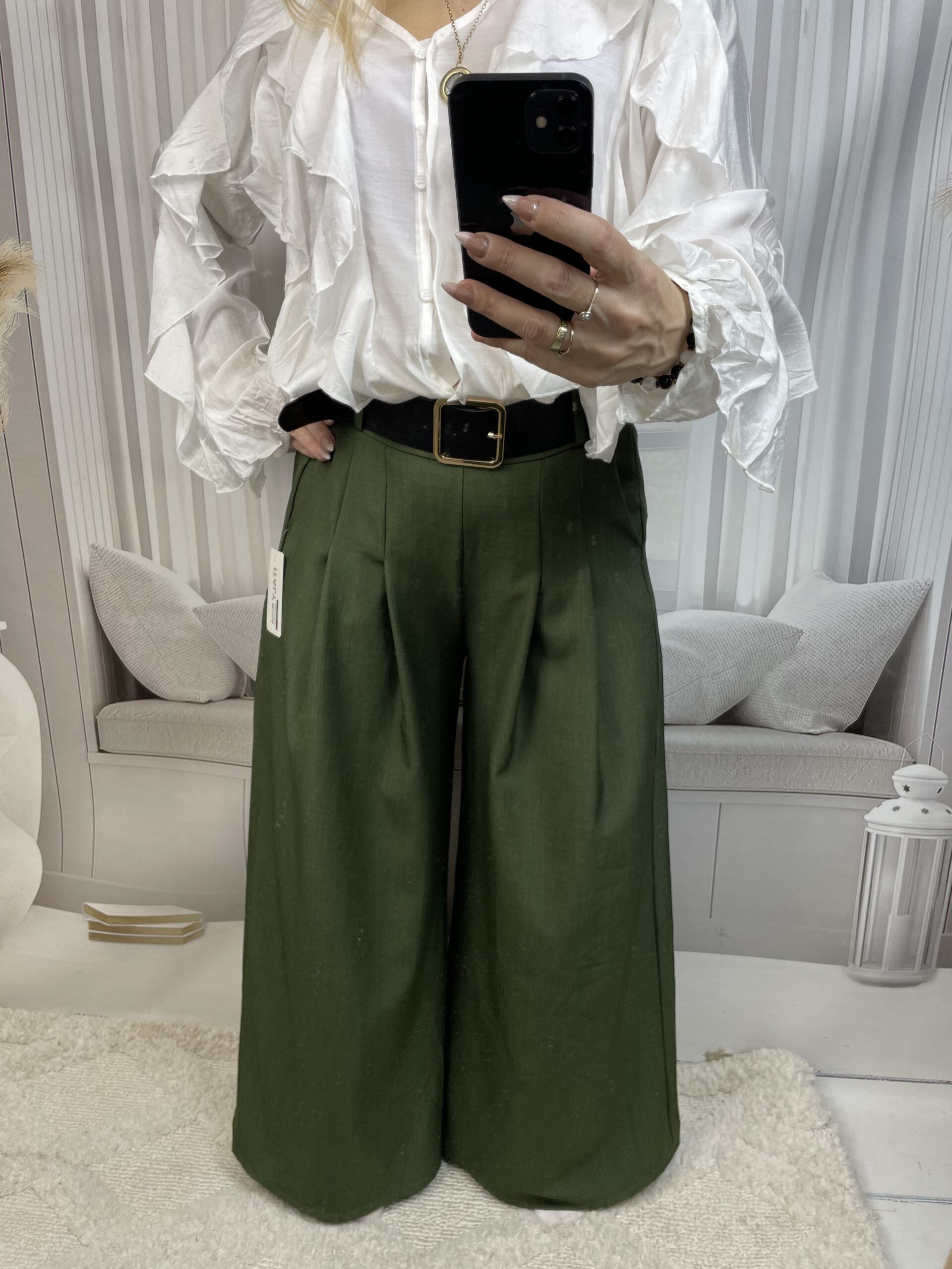 W zestawie znajduje się dopasowany pasek, który podkreśla talię i pozwala dopasować spodnie do figury. To model, który sprawdzi się zarówno w eleganckiej stylizacji do pracy, jak i w codziennym looku z koszulą lub swetrem.