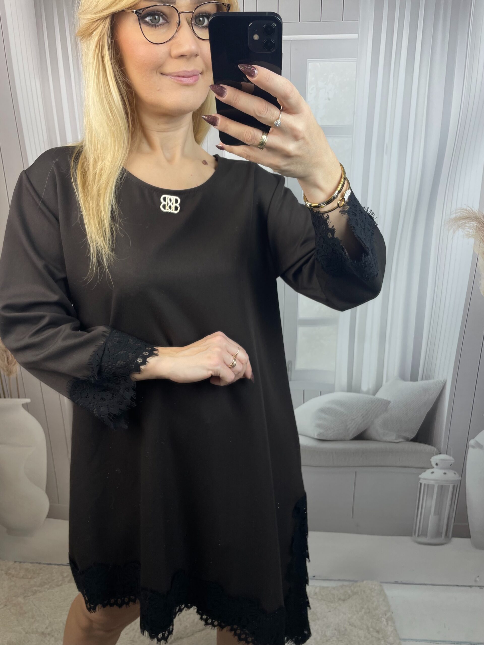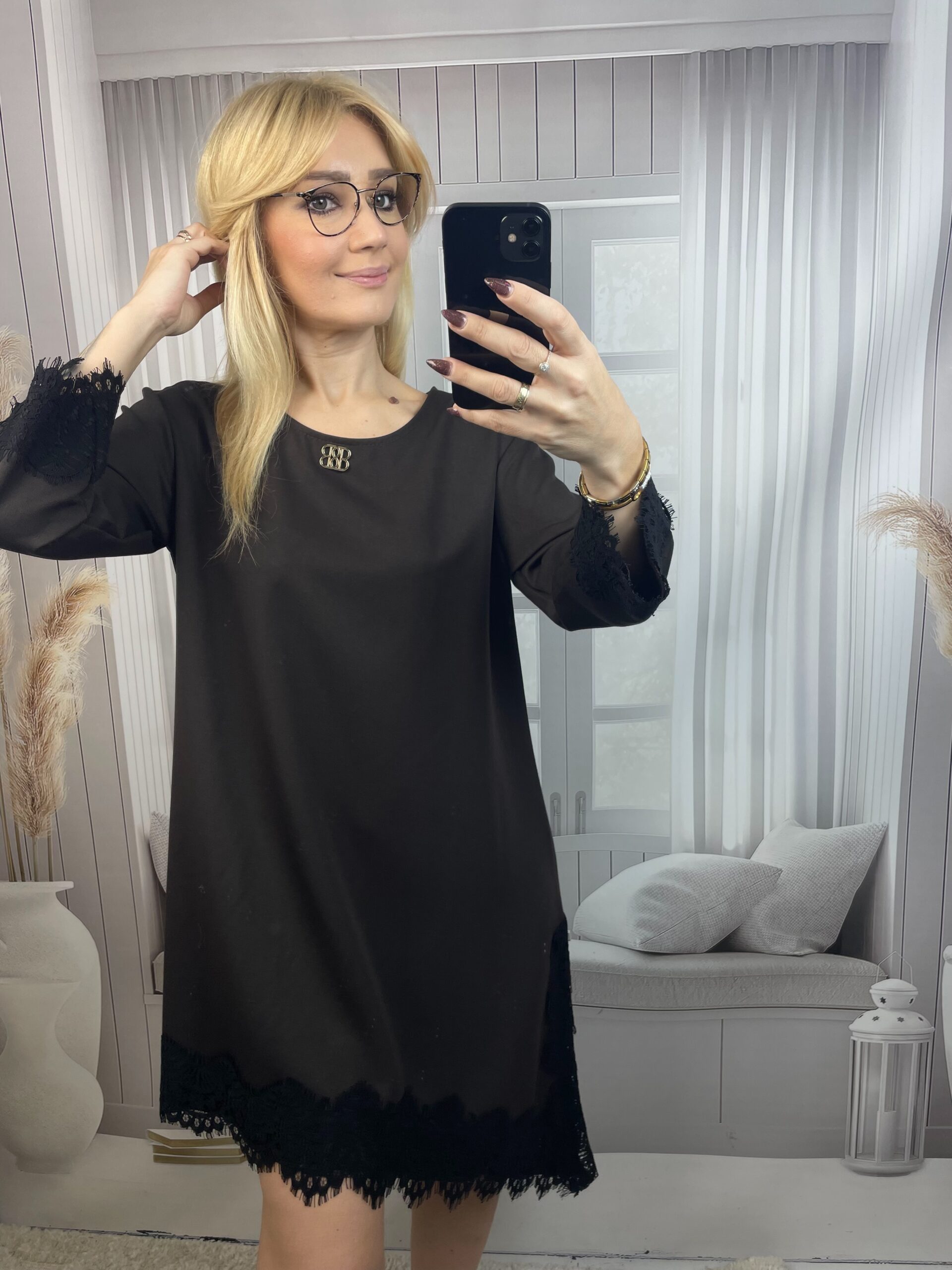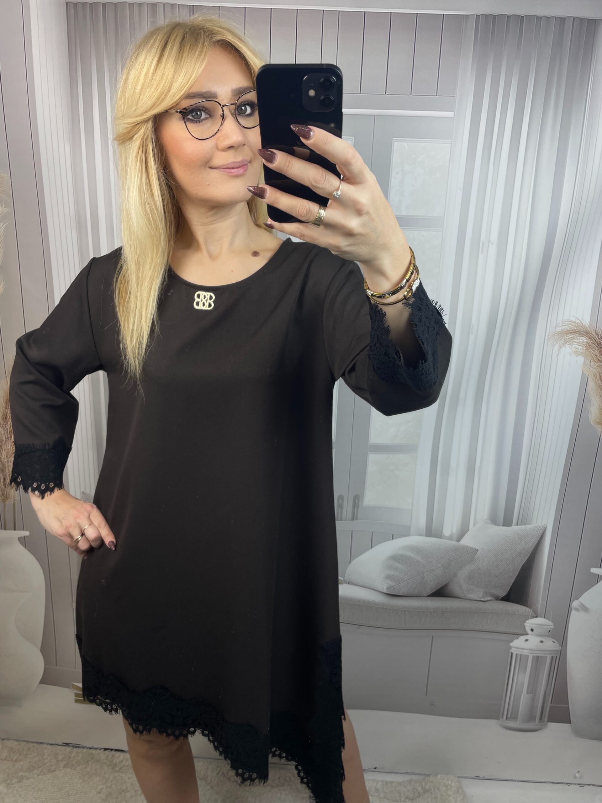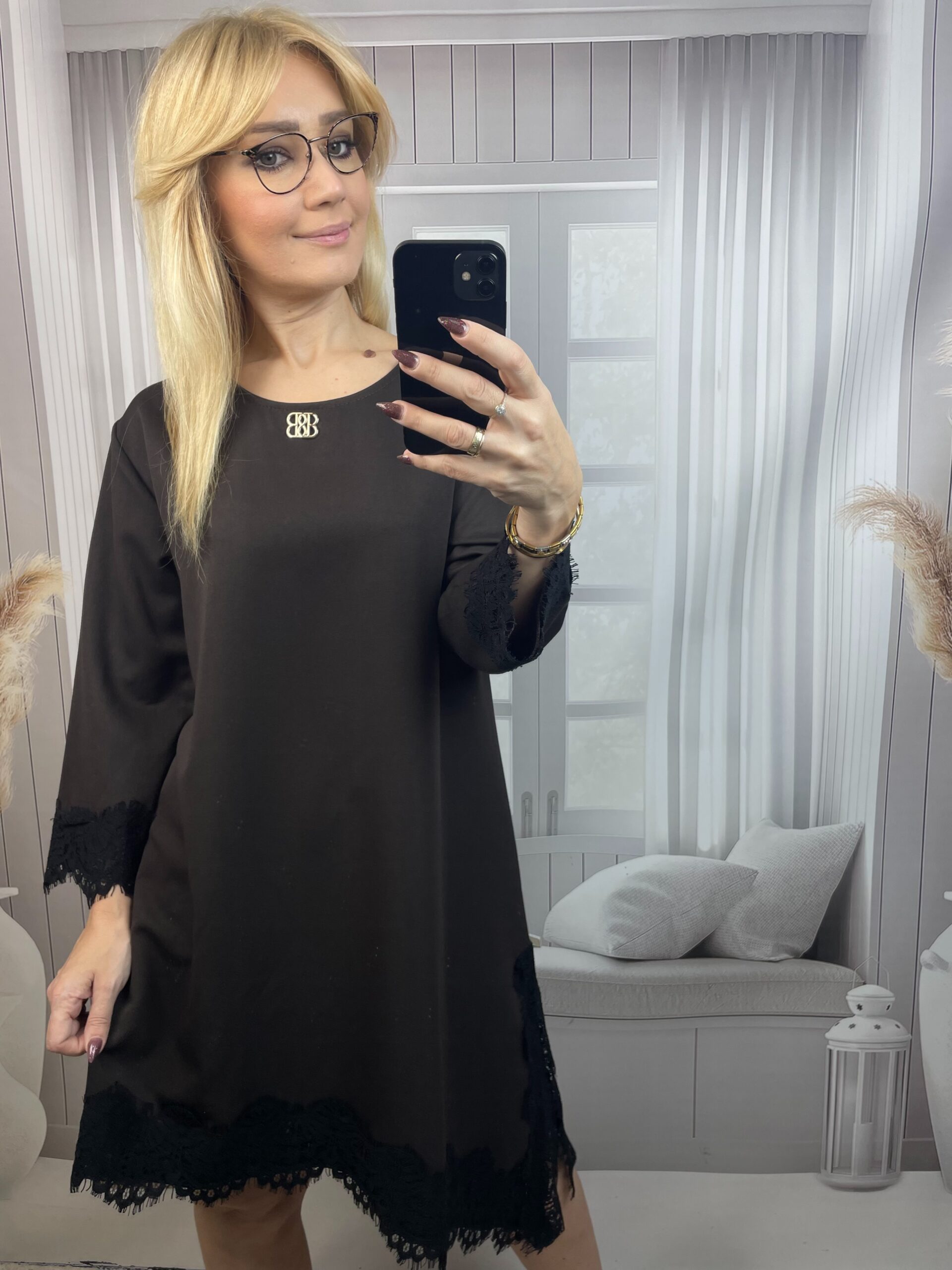 Dół sukienki został wykończony koronką, która nadaje całości romantycznego i kobiecego wyrazu. Ten sam motyw pojawia się na rękawie, dzięki czemu sukienka prezentuje się spójnie, luksusowo i wyjątkowo dopracowanie. To detal, który sprawia, że kreacja wygląda jak z butików premium, choć pozostaje przyjazna dla portfela.
