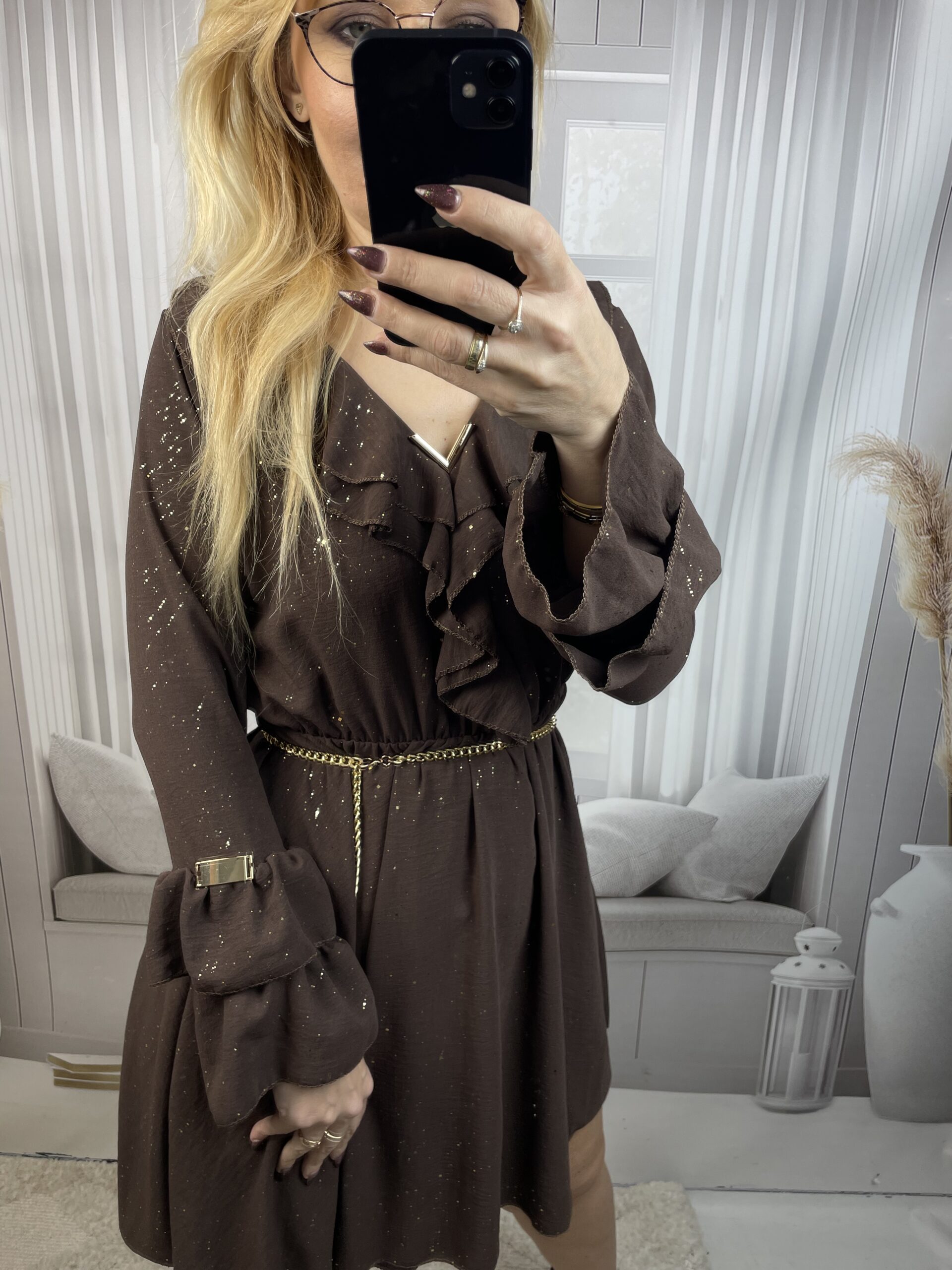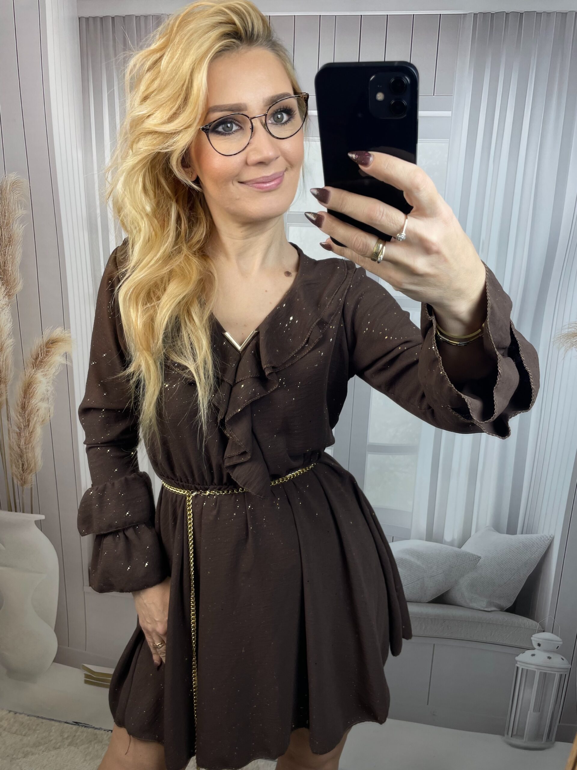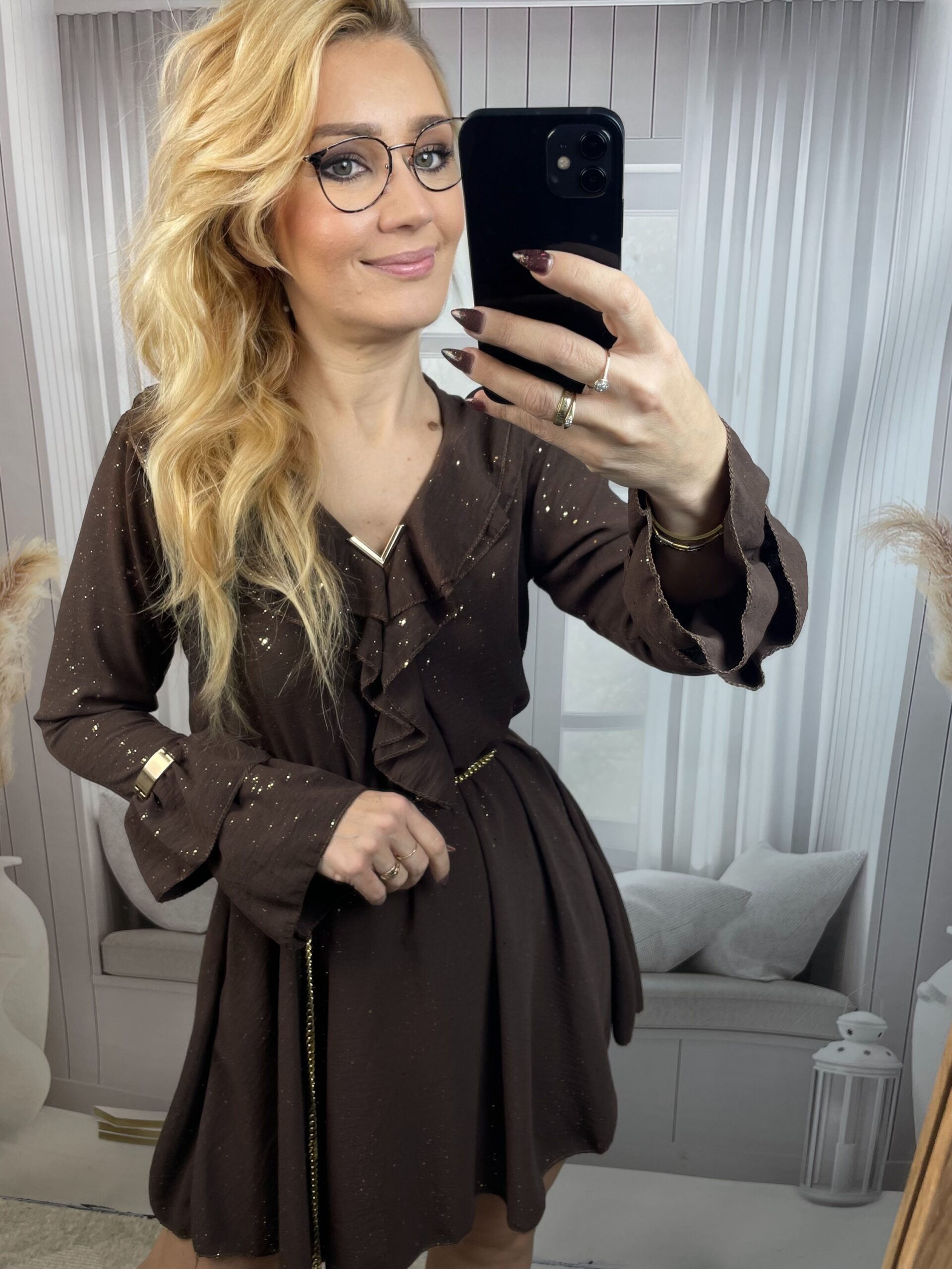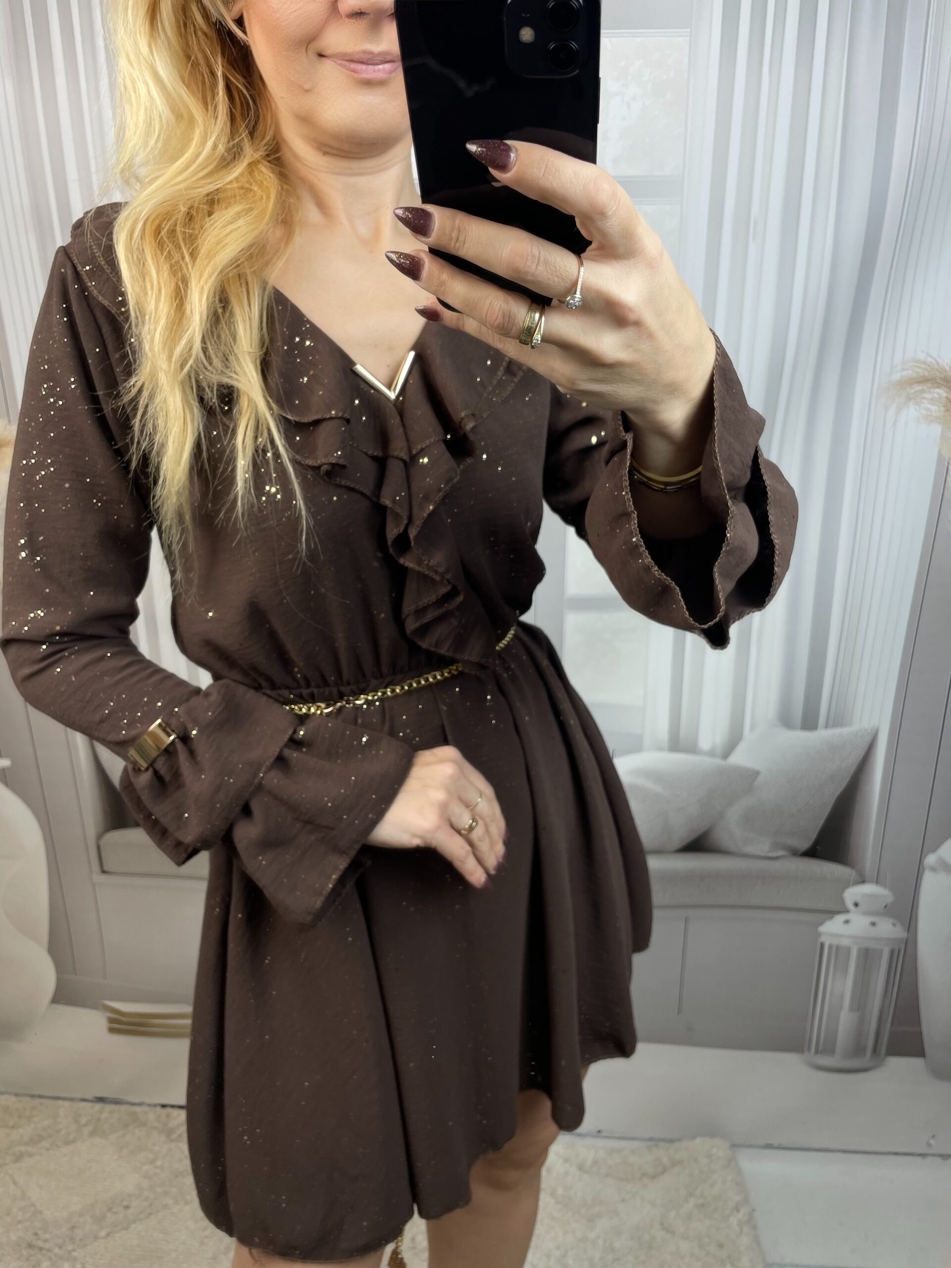 Sukienka mini z żabotem i falbanami – cała obsypana złocistym pyłkiem