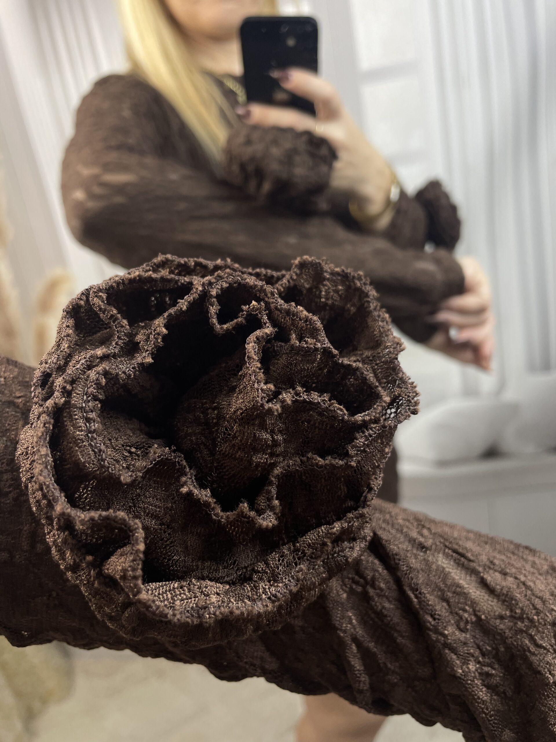 Najbardziej charakterystycznym elementem modelu są modne róże na obu rękawach — detal, który przyciąga spojrzenia i dodaje sukience wyjątkowego, romantyczno-nowoczesnego charakteru.To sukienka, która sprawi, że każde wyjście stanie się wyjątkowe.