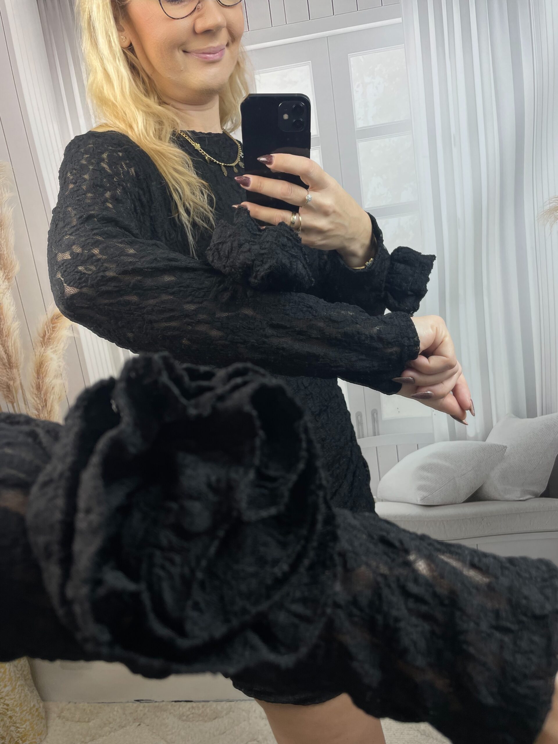 Sukienka Mini Koronkowa z Różą Jasny Czarna