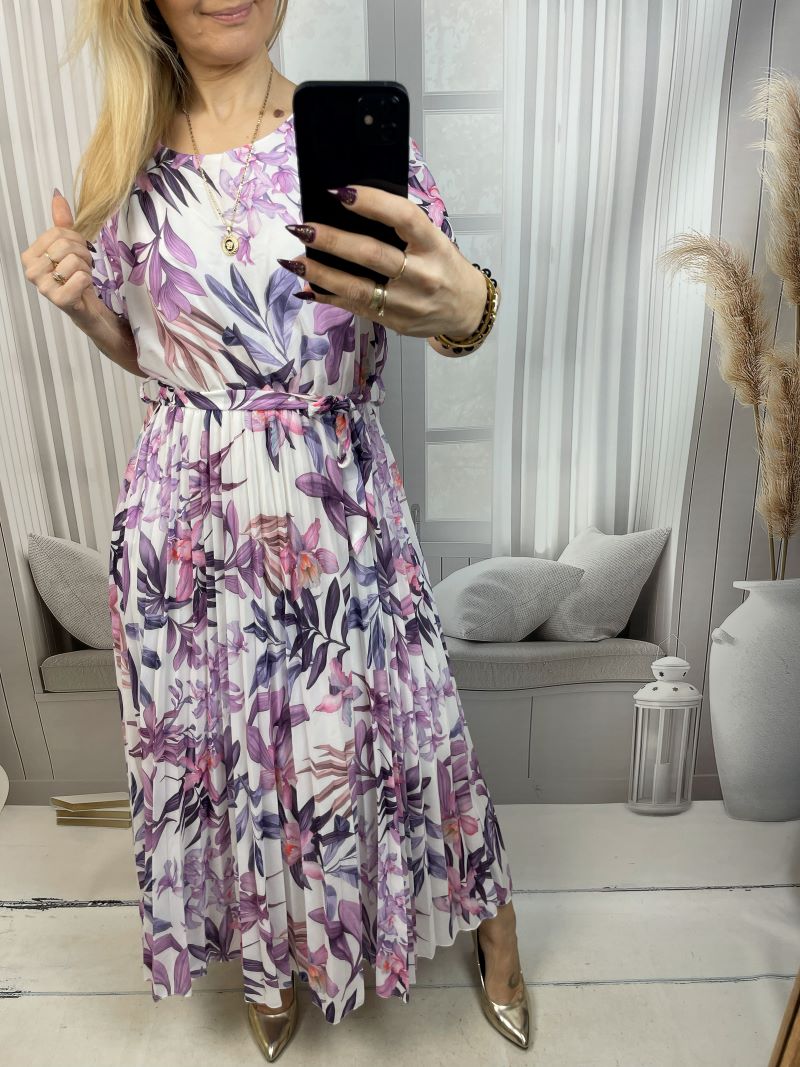 Jej największym atutem jest klasyczny okrągły dekolt. Dół sukienki jest plisowany, dzięki czemu pięknie pracuje w ruchu i dodaje sylwetce lekkości — idealnie na wiosenne spacery, wyjścia i wyjątkowe okazje.