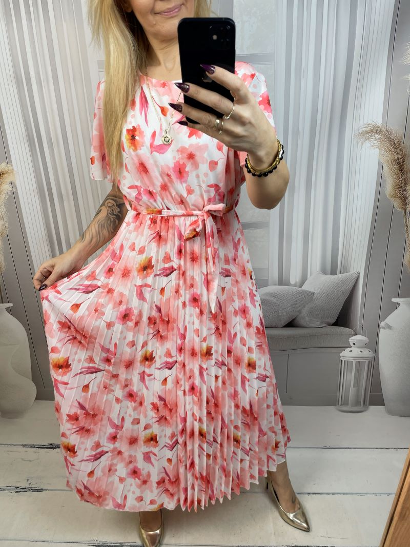 Sukienka Plisowana z Klasycznym Dekoltem Koral