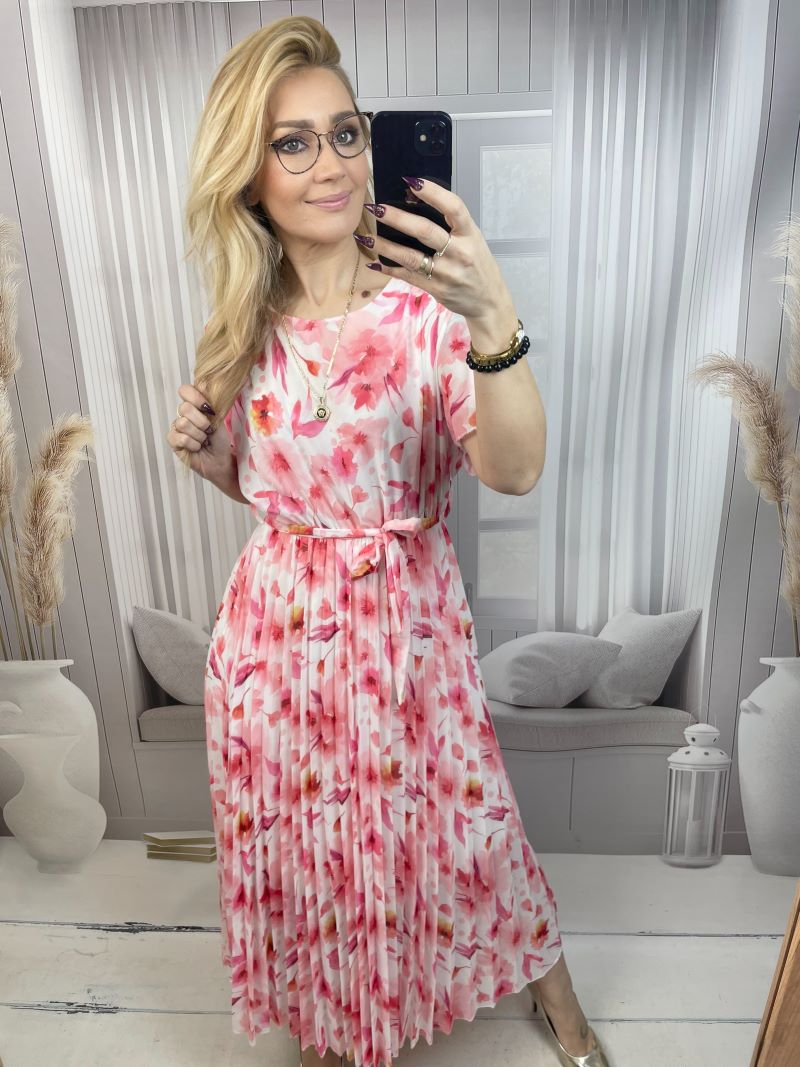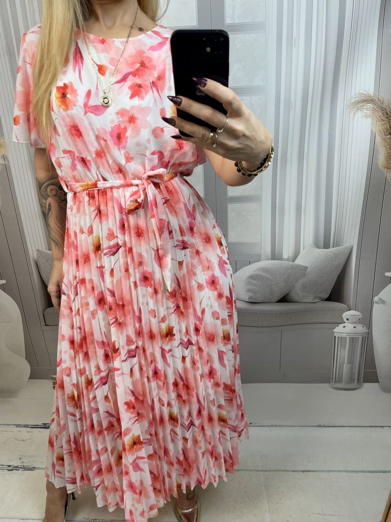Jej największym atutem jest klasyczny okrągły dekolt. Dół sukienki jest plisowany, dzięki czemu pięknie pracuje w ruchu i dodaje sylwetce lekkości — idealnie na wiosenne spacery, wyjścia i wyjątkowe okazje.
