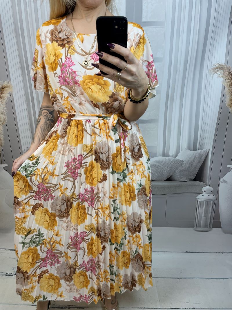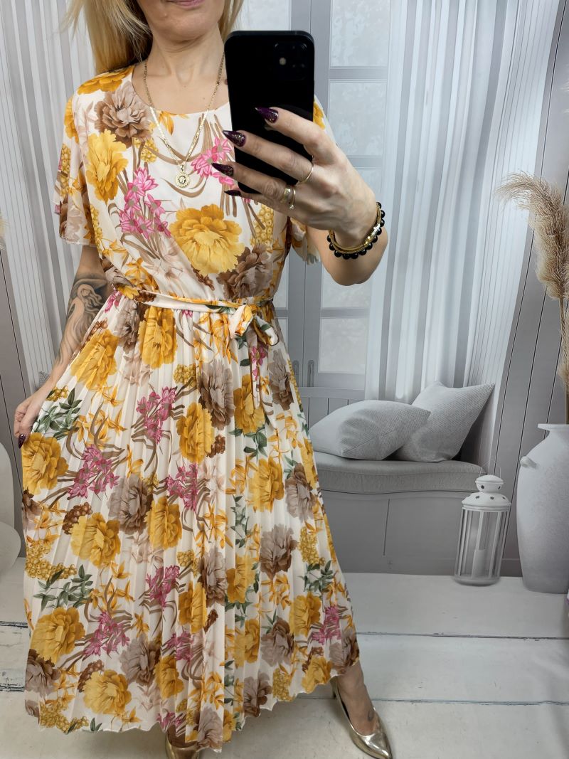 Jej największym atutem jest klasyczny okrągły dekolt. Dół sukienki jest plisowany, dzięki czemu pięknie pracuje w ruchu i dodaje sylwetce lekkości — idealnie na wiosenne spacery, wyjścia i wyjątkowe okazje.