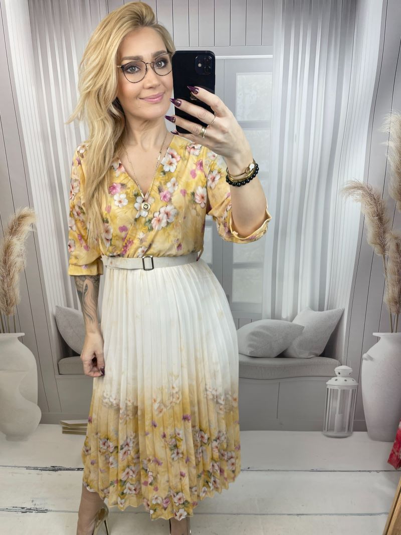 Jej największym atutem jest kopertowy dekolt, który cudownie podkreśla biust i wysmukla szyję, a jednocześnie wygląda niezwykle elegancko. Dół sukienki jest plisowany, dzięki czemu pięknie pracuje w ruchu i dodaje sylwetce lekkości — idealnie na wiosenne spacery, wyjścia i wyjątkowe okazje.