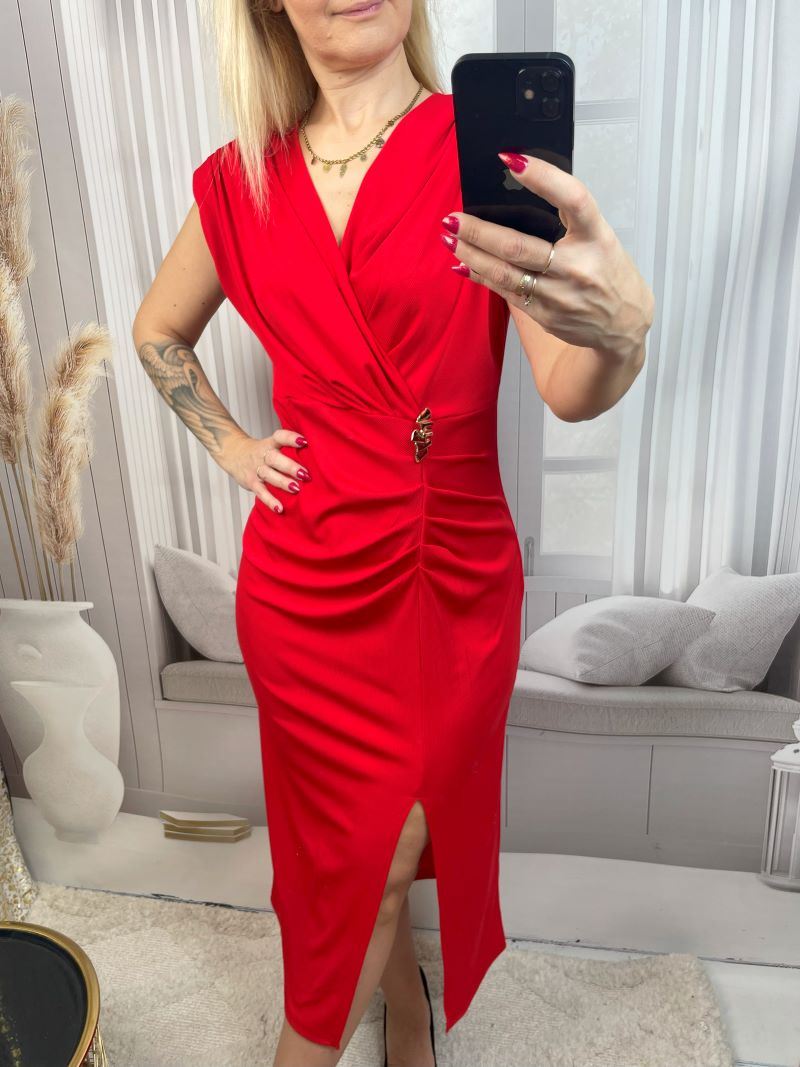 Sukienka prążkowana midi z marszczonym ramieniem, poduszeczką, kopertowym dekoltem i złotą broszką – model, który robi efekt „WOW” w sekundę