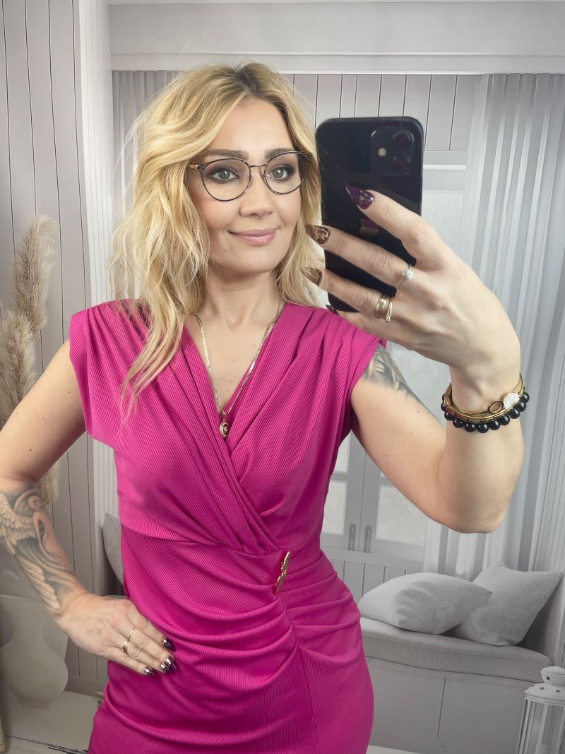 Sukienka Prążkowana z Dekoltem V Fuksja S/M