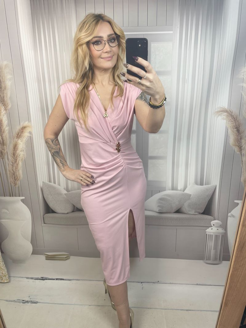 Sukienka Prążkowana z Dekoltem V Pudrowy Róż S/M