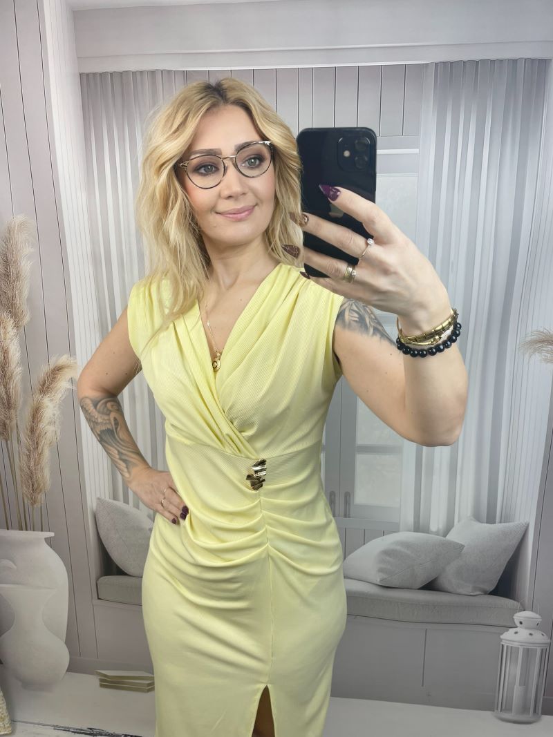 Sukienka Prążkowana z Dekoltem V Żółta S/M