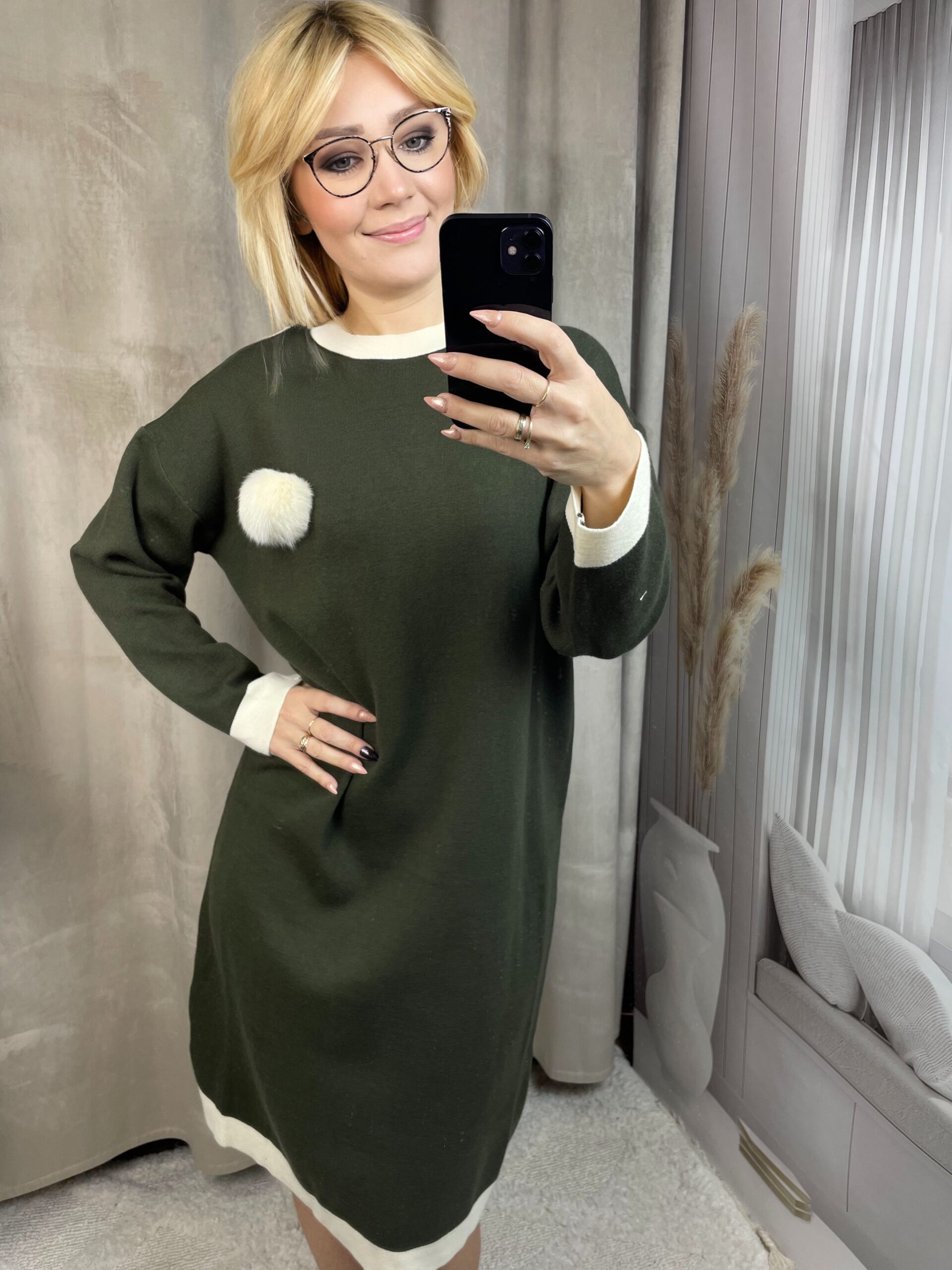Sukienka z Broszką z Grubej Dzianiny Oliwka - Kozar