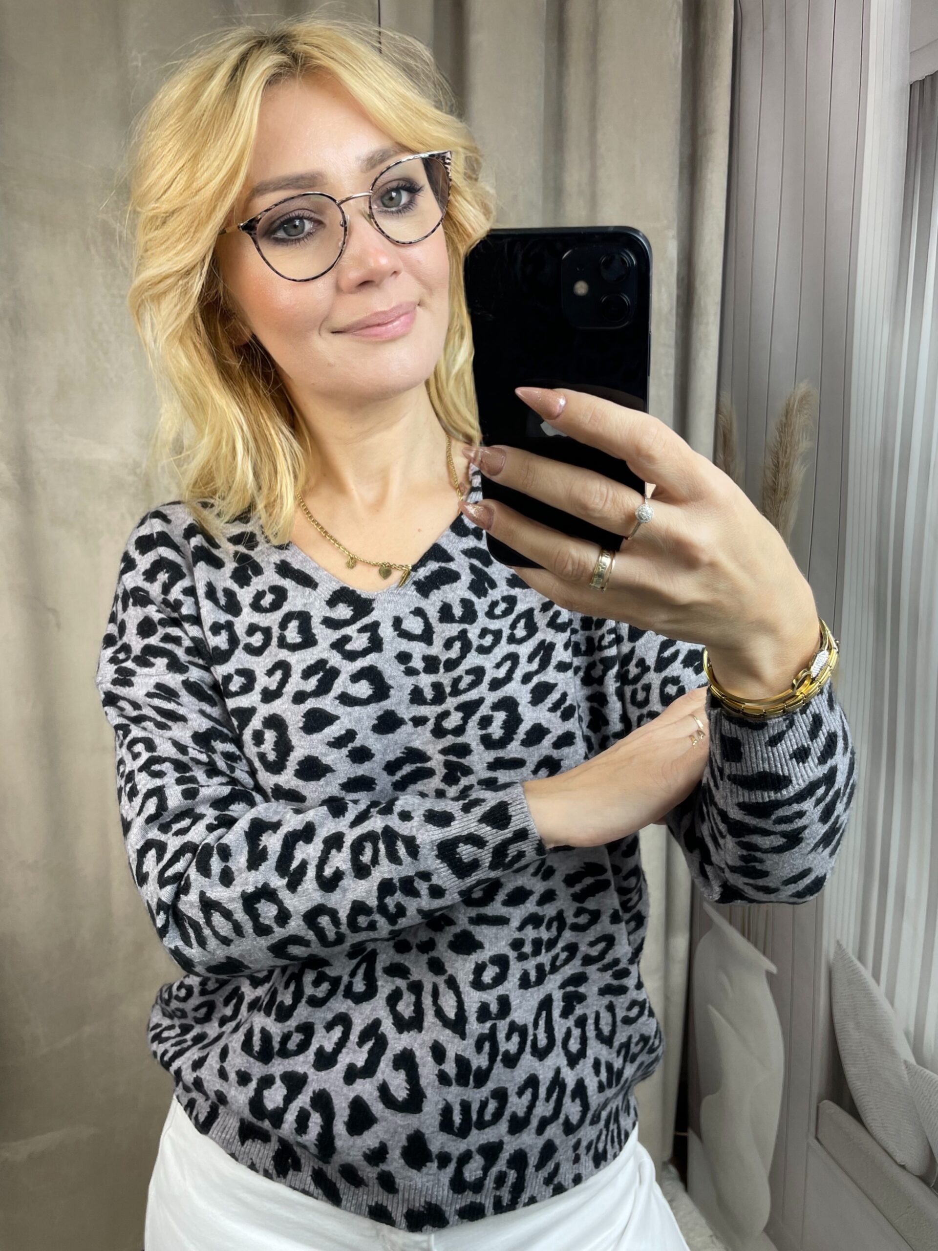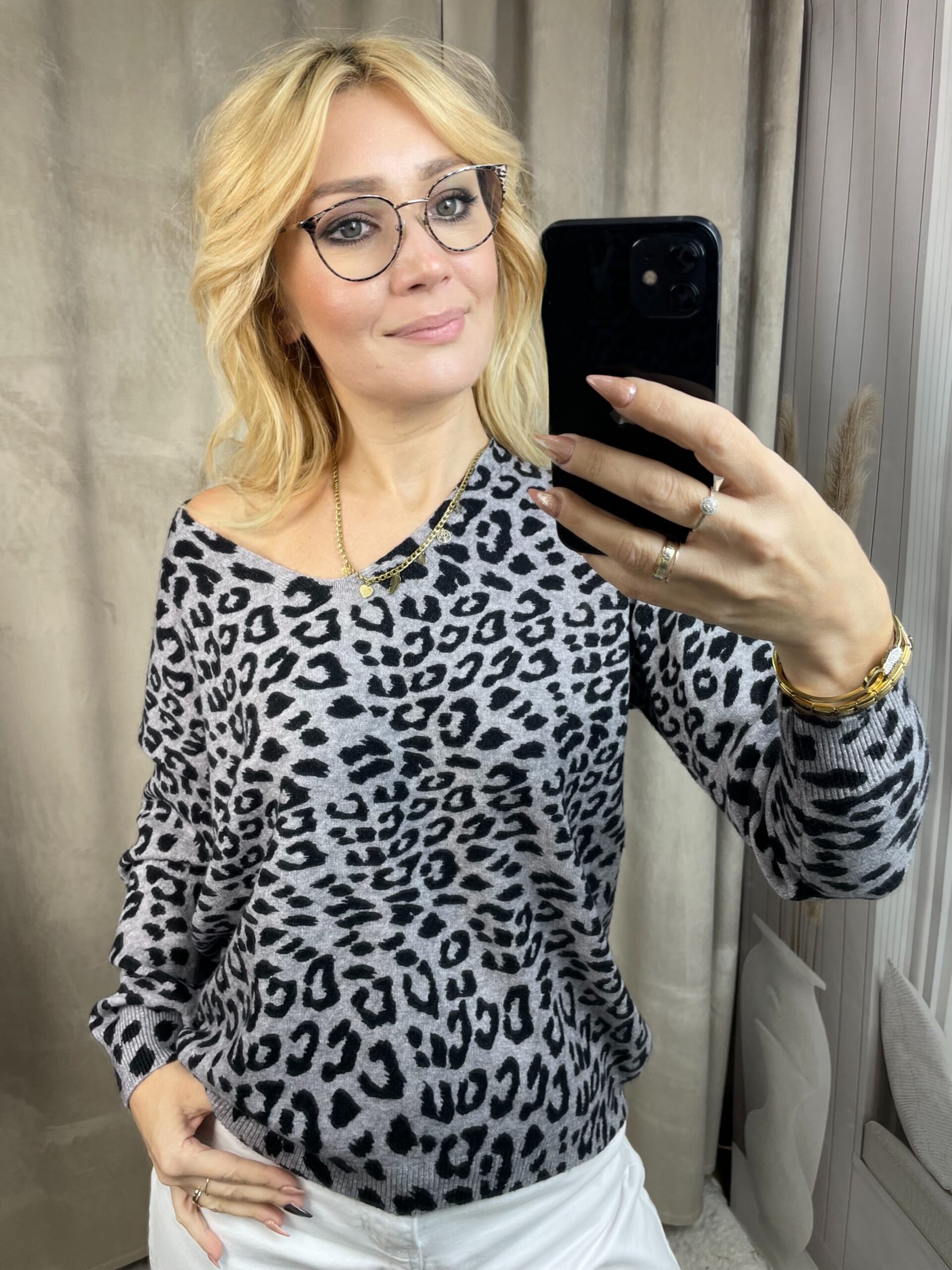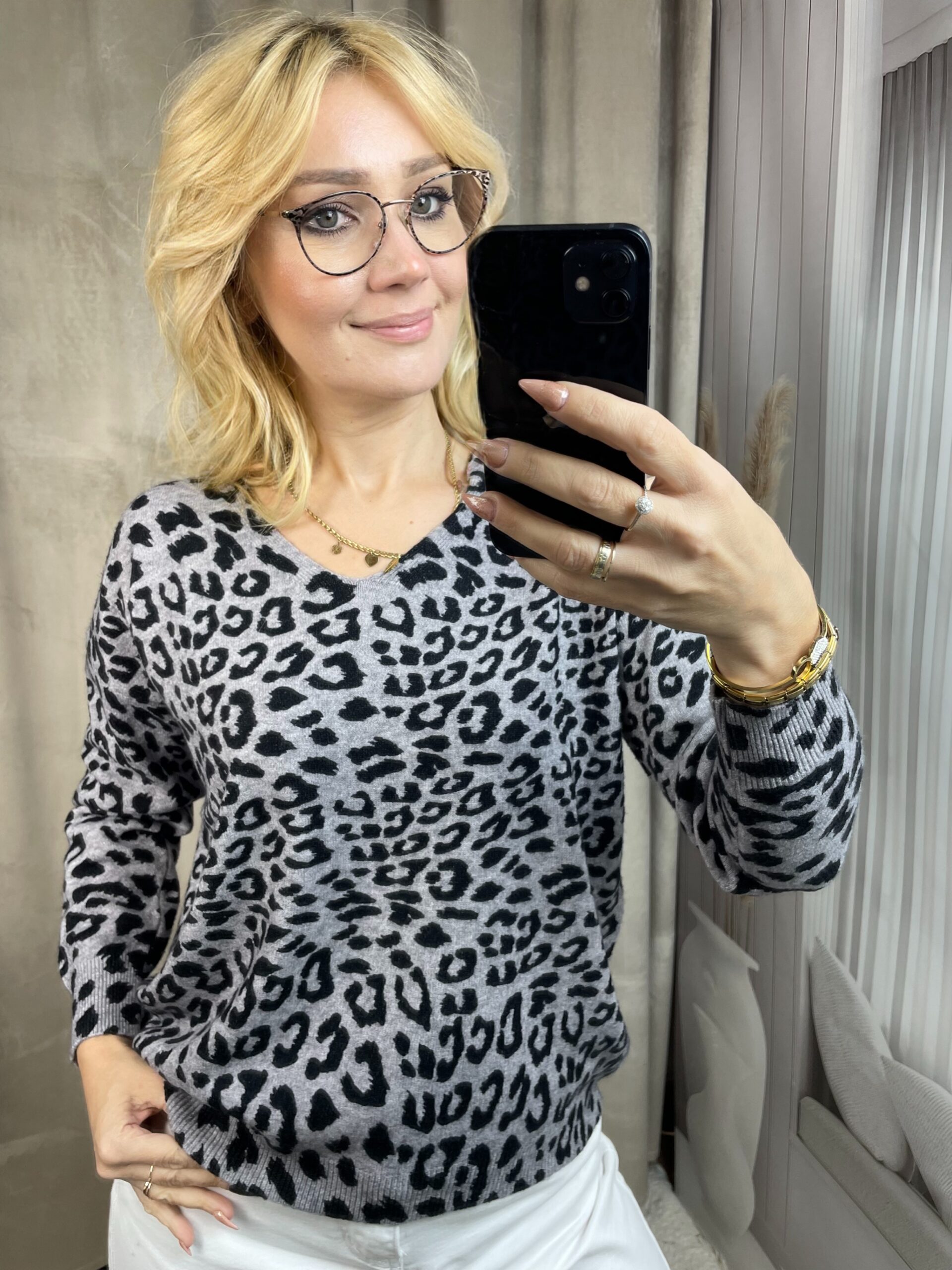 Prześliczny sweter damski, wykonany z mięciutkiej i elastycznej dzianiny, która zapewnia komfort noszenia.Głównym elementem ozdobnym jest panterkowy print i dekolt V który umożliwia zrzucenie go na ramie , nadając całej stylizacji nieco seksapilu. Sweter posiada długi rękaw. >