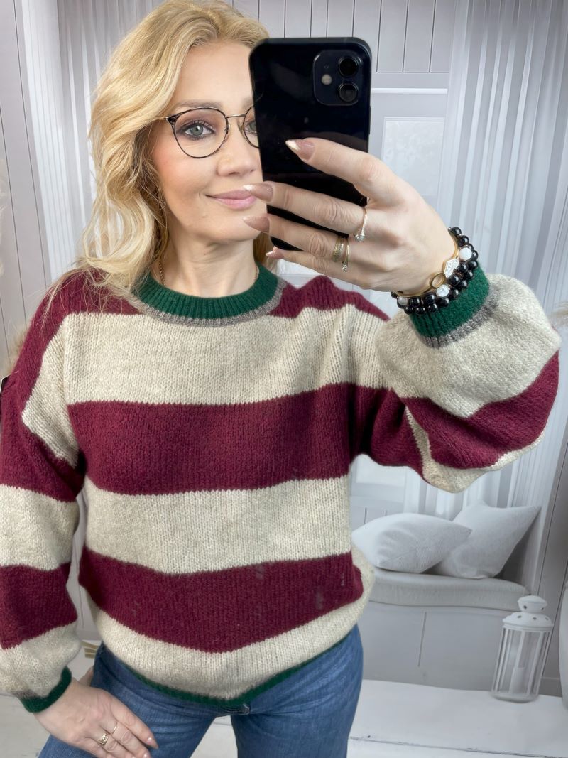 Wyraziste szerokie pasy w kontrastowych kolorach przyciągają wzrok i dodają stylizacji energii, podkreślając modowy charakter całości. Klasyczny, okrągły dekolt zapewnia wygodę noszenia i sprawia, że sweter doskonale układa się na sylwetce oraz pasuje do wielu zestawów – od casualowych po bardziej eleganckie.