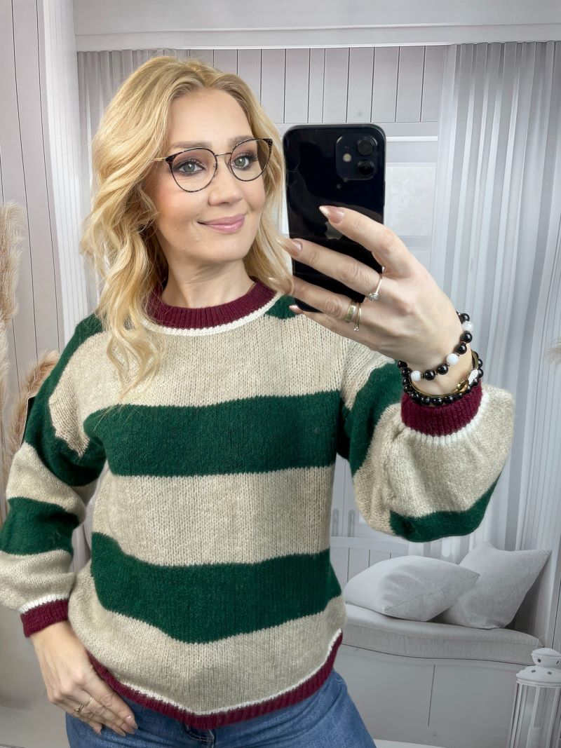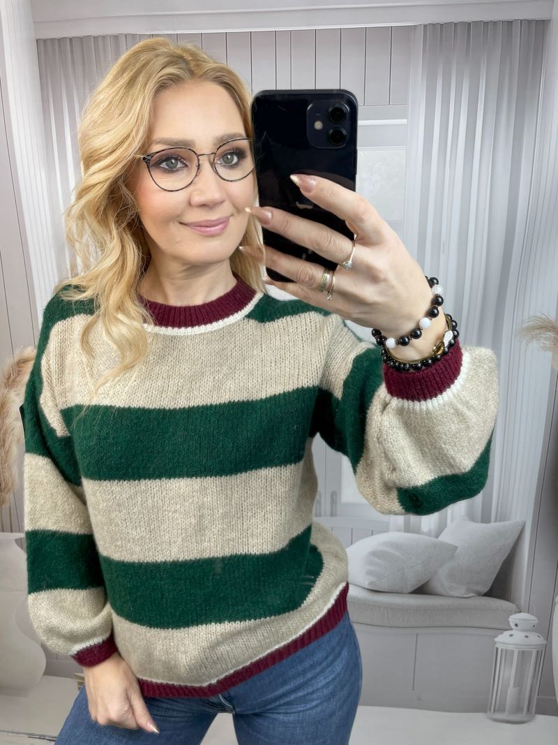 Wyraziste szerokie pasy w kontrastowych kolorach przyciągają wzrok i dodają stylizacji energii, podkreślając modowy charakter całości. Klasyczny, okrągły dekolt zapewnia wygodę noszenia i sprawia, że sweter doskonale układa się na sylwetce oraz pasuje do wielu zestawów – od casualowych po bardziej eleganckie.