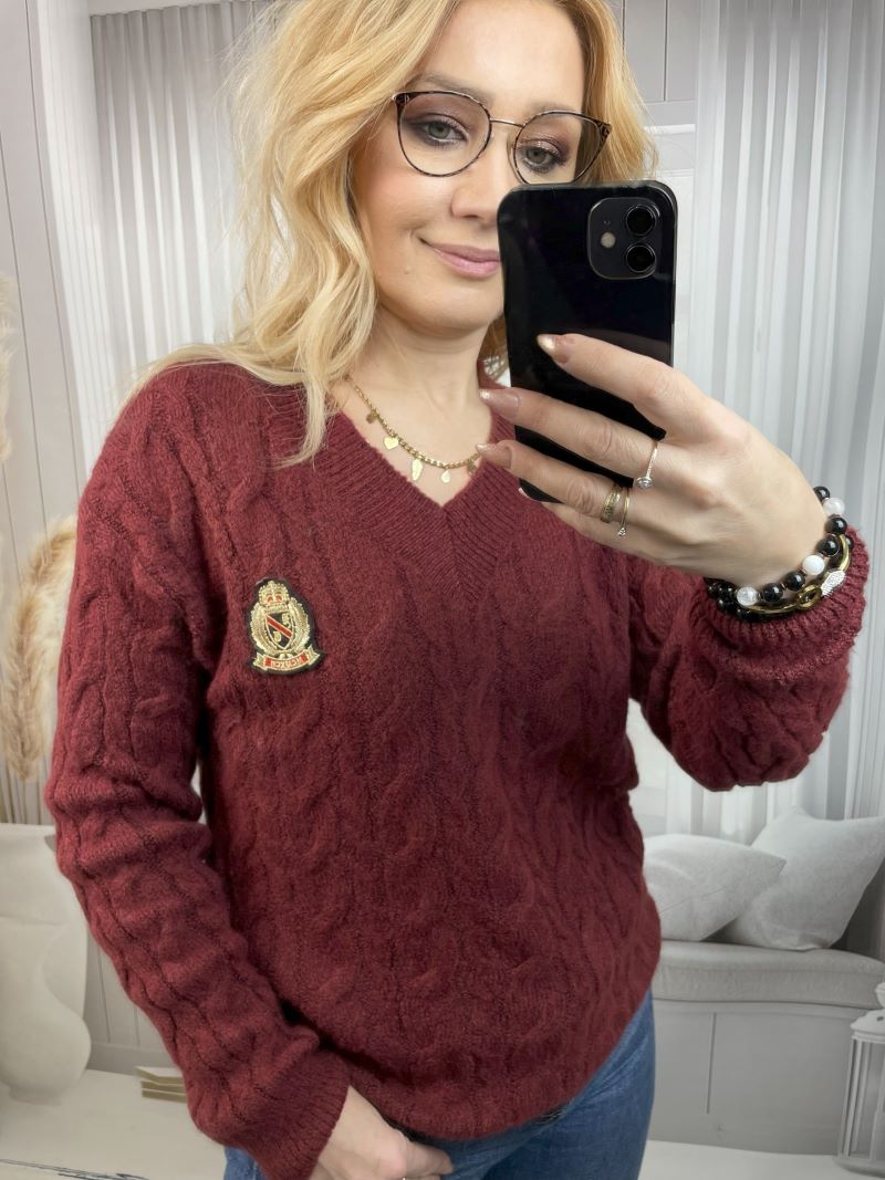 Model zachwyca wrabianym wzorem, który dodaje głębi i nowoczesnego charakteru, a dekolt w kształcie litery V pięknie wysmukla sylwetkę, podkreślając szyję i obojczyki. Całość dopełnia niebanalna naszywka na boku – subtelny, ale wyrazisty detal, który nadaje swetrowi unikalnego stylu i wyróżnia go spośród klasycznych fasonów.